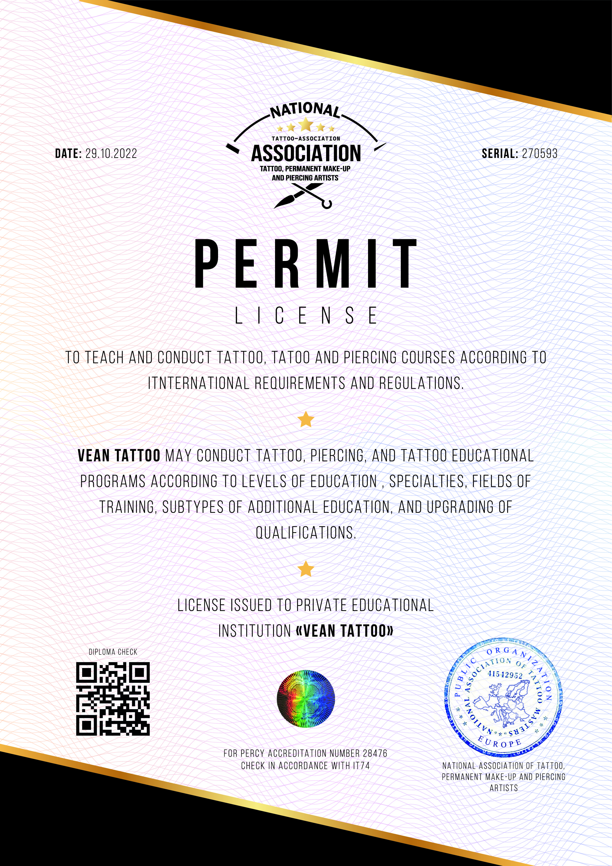 NAM hat die Möglichkeit, die Echtheit des Dokuments über den Erwerb der Qualifikation eines bestimmten Tätowierers zu überprüfen.