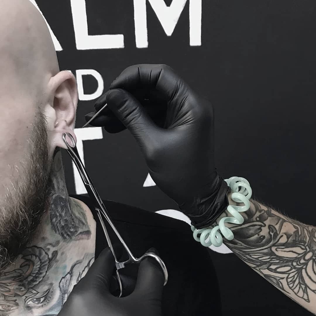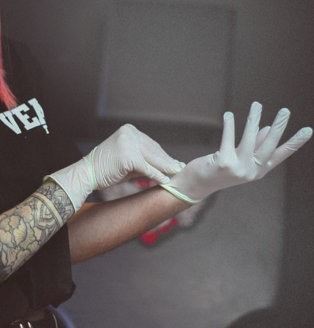 Handschuhe sollten ausschließlich zum Einmalgebrauch bestimmt sein und nach jedem nachfolgenden Kunden gewechselt werden. Jeder Kontakt mit nicht sterilen Oberflächen (Telefon, Türklinke, fallengelassenes Werkzeug usw.) muss einen Handschuhwechsel und eine Sterilisation der Hände zur Folge haben. Wenn der Handschuh zerrissen ist, muss er ersetzt werden.
