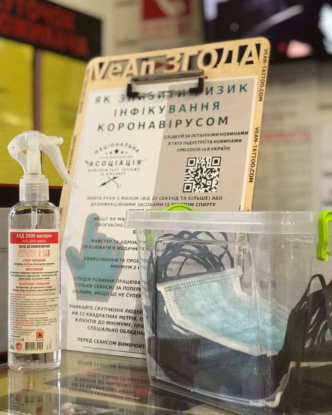 Dazu muss der Tattoo-Meister vor der Arbeit mit einem Kunden alle zu berührenden Oberflächen sterilisieren: alle Tische, Untergestelle, Stühle, Lampen, eine Tätowiermaschine, Stromversorgungsgerät, alle Tuben mit Farbpigmenten.