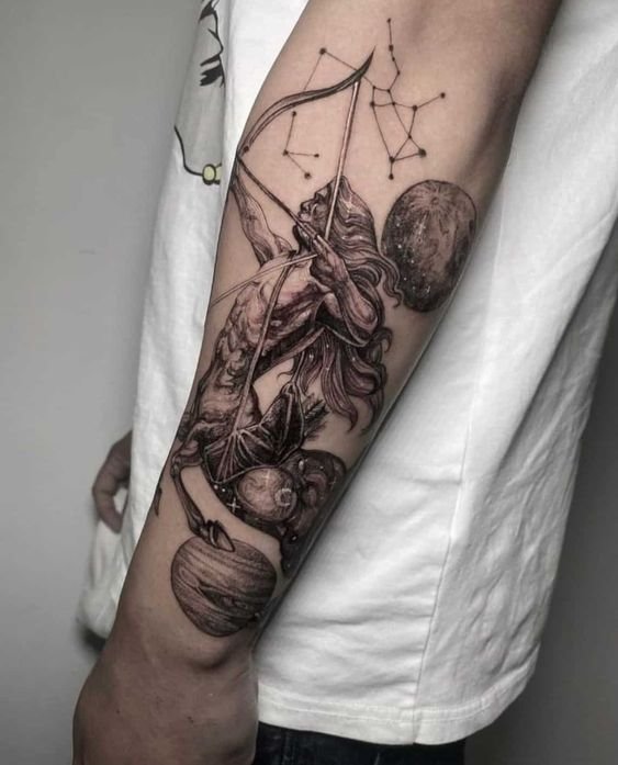 Der Zentaur, der den Schützen symbolisiert, ist ein ziemlich großes und massives Wesen. Daher ist es besser, ihn auf der Brust, dem Rücken, dem Rumpf, dem Unterarm oder den Beinen zu platzieren, die viel Platz für die Arbeit des Tattoo-Künstlers bieten. Es gibt auch viele andere Bilder und Symbole, die mit dem Schützen in Verbindung stehen. Wir stellen Ihnen einige originelle Ideen vor, die als Grundlage für den Entwurf eines astrologischen Tattoos dienen können: