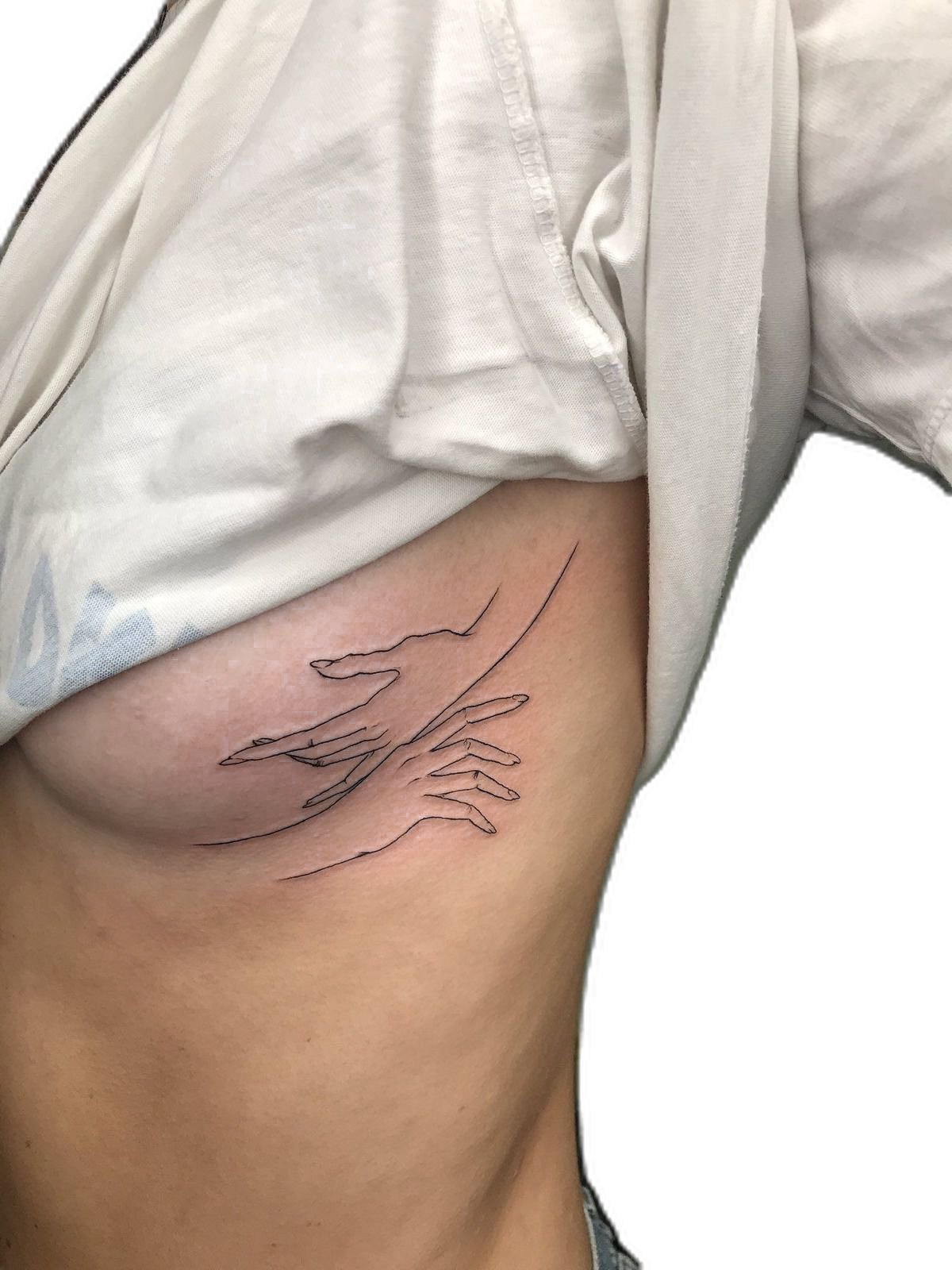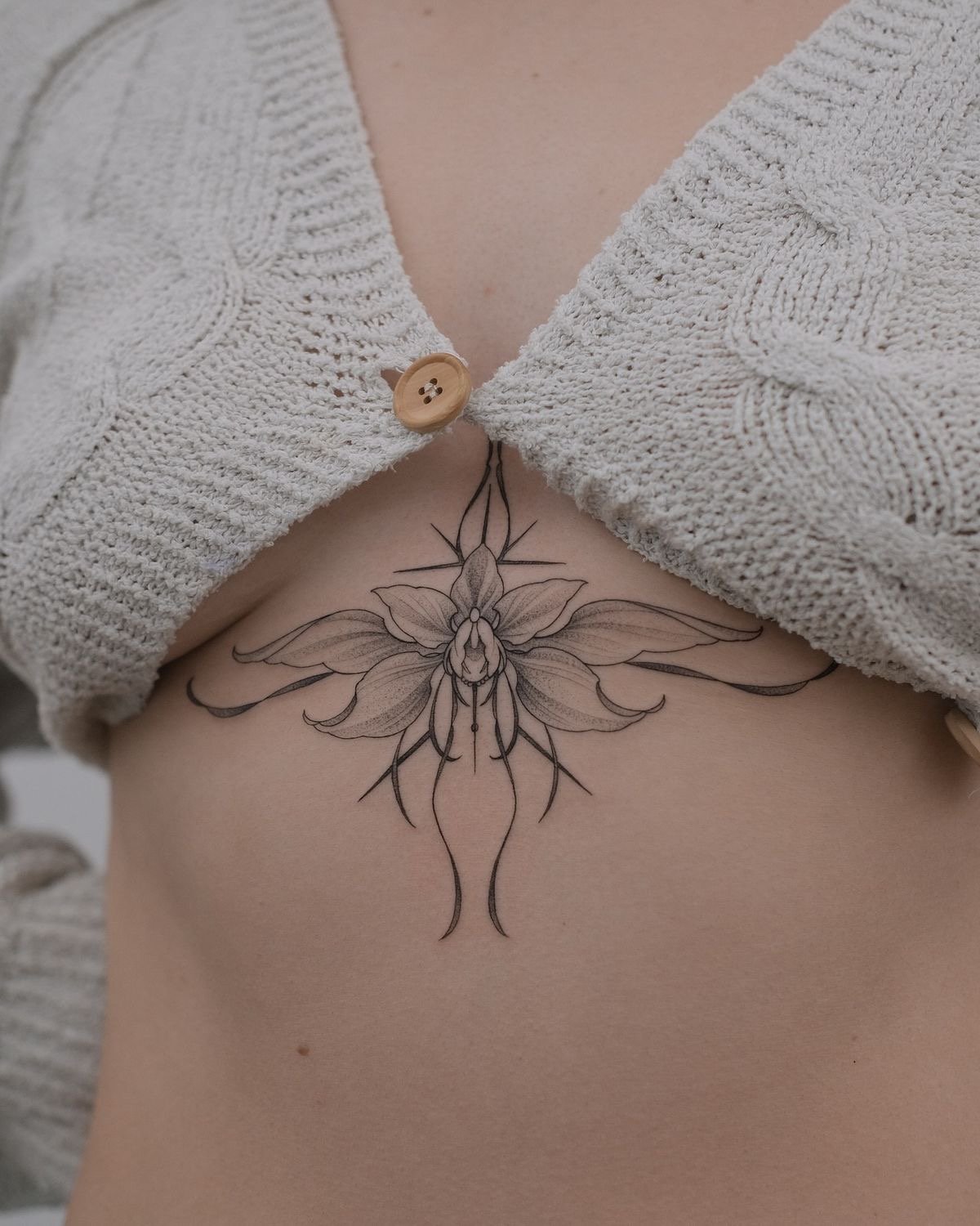 - Underboob Fineline Tattoo: Durch hauchdünne Linien entstehen zarte, elegante Motive, die sich harmonisch an die Körperform anschmiegen.
