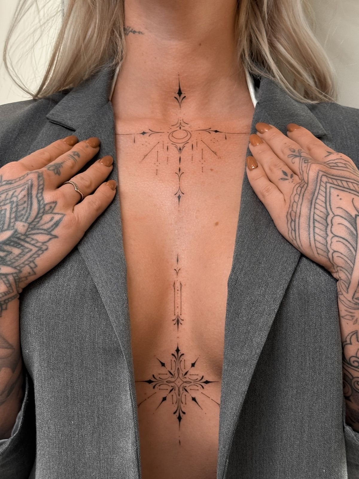 - Geometrische und ornamentale Designs: Klare Strukturen und Linien betonen die Symmetrie des Körpers und schaffen einen modernen Look.