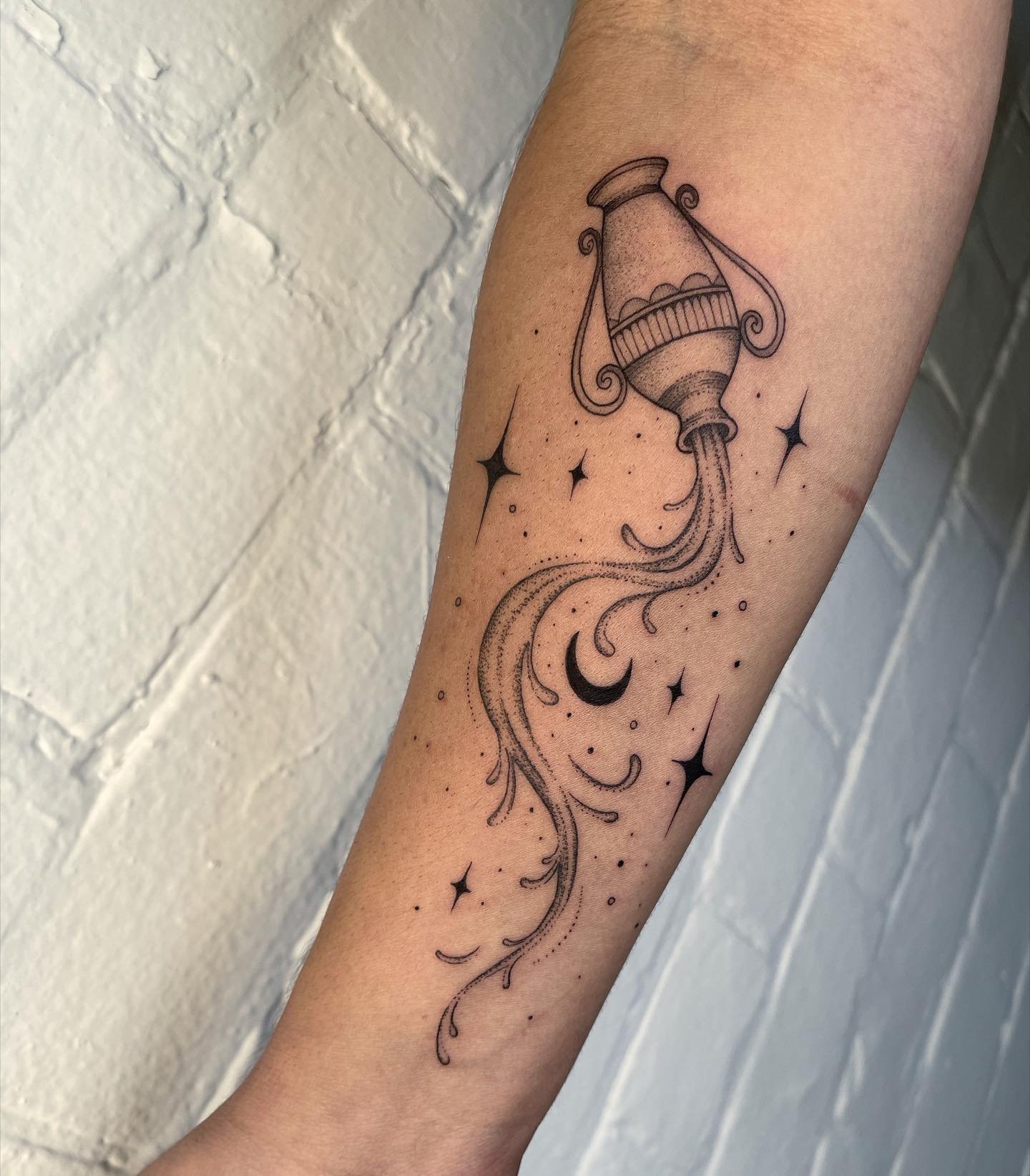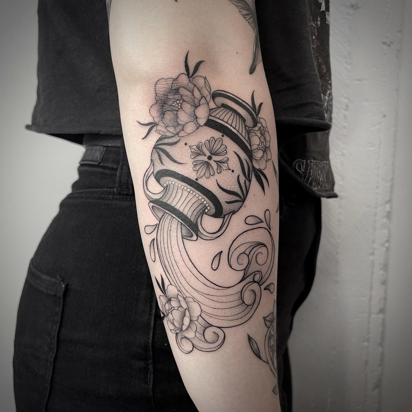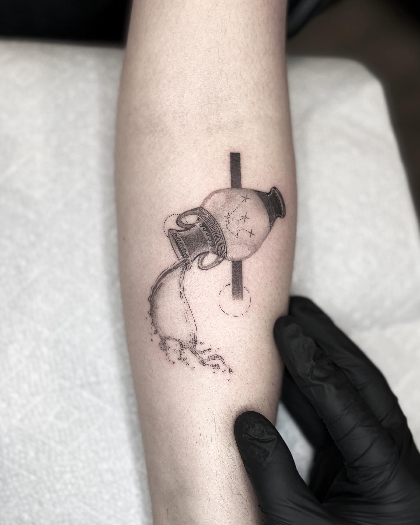 - Ein einfaches Motiv, das einen Krug darstellt, aus dem Wasser fließt, ist eine gute Lösung für eine vertikale Tätowierung auf Arm oder Bein, da der Wasserstrom über eine beliebige Strecke abwärts fließen kann .