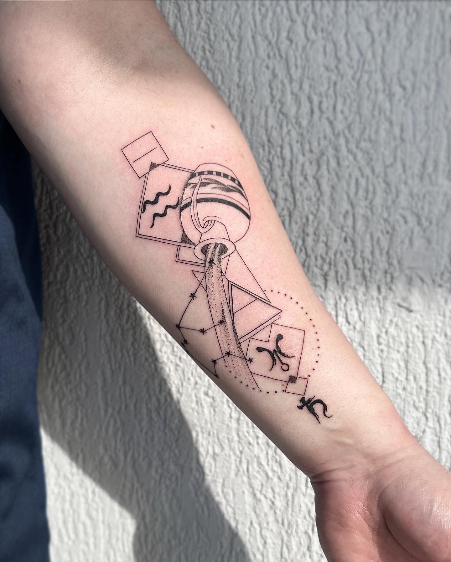 - Minimalistische Tätowierung des Konstellation Wassermann. Die Skizze impliziert ein heikles Design, in dem alle Sterne durch dünne Linien verbunden sind. Die Tätowierung sieht gut aus auf dem Schlüsselbein, der Brust, dem Handgelenk oder sogar hinter dem Ohr.