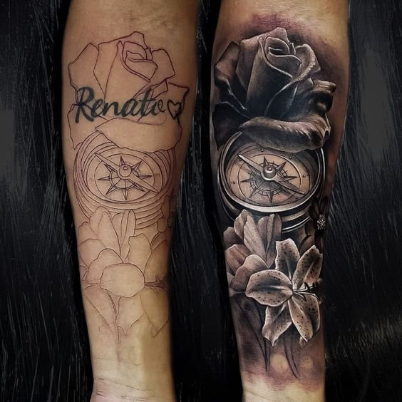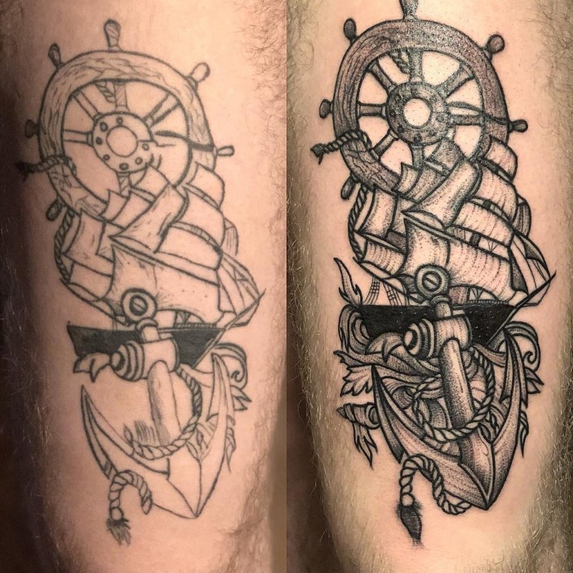 Neue Elemente werden hinzugefügt, das Bild wird detailliert, mit Farbaktualisierungen, Schatteneffekten und Retuschen. Das Ergebnis ist eine völlig neue Tätowierung. In diesem Fall ist es nicht notwendig, das alte Design zu bearbeiten, da die Arbeiten um dieses herum durchgeführt werden.