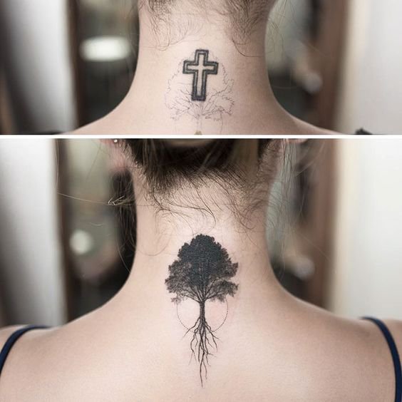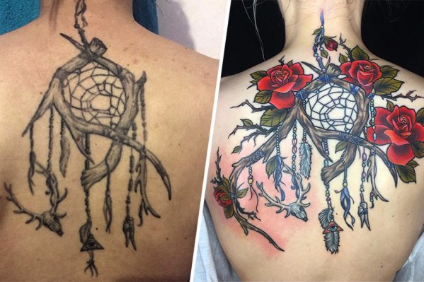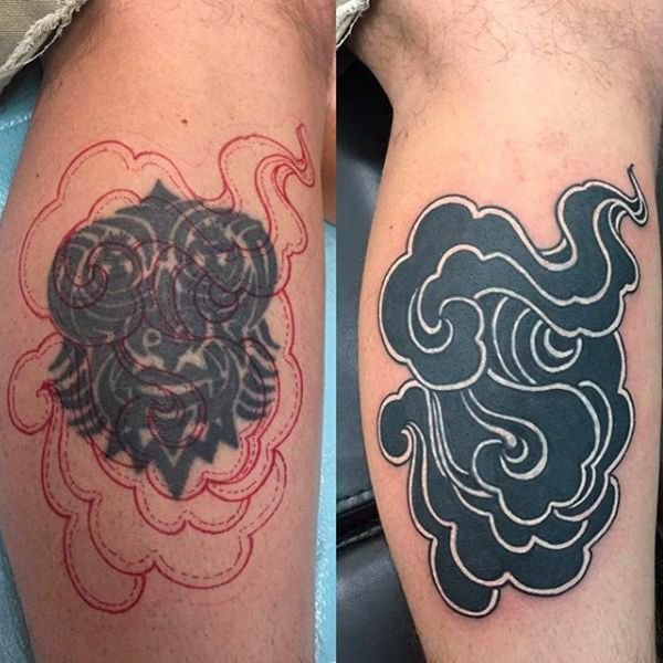 Die Elemente des neuen Musters müssen mit den Hauptlinien der alten Tätowierung übereinstimmen, als ob sie ihr gehorchen würden. Bei einem geometrischen Bild mit klaren Linien und Winkeln ist es beispielsweise nicht möglich, ein Porträt zu zeichnen. Die Aufgabe des Meisters ist es, eine Skizze aufzugreifen oder zu entwickeln, die auf der alten Tätowierung "liegt" und sie überdeckt.