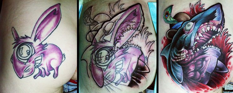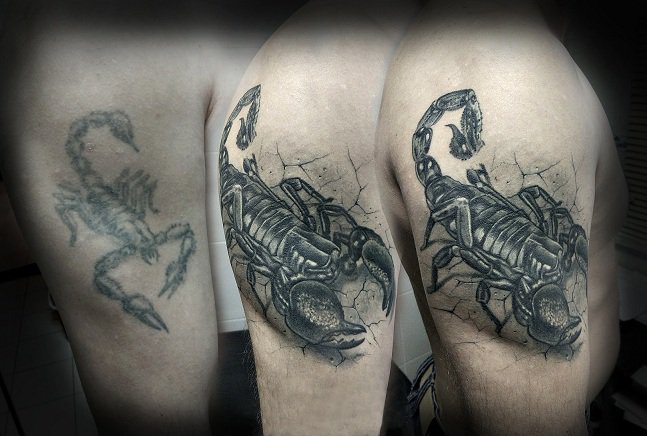 Man kann Tattoos nicht unbedingt loswerden, ohne eine langwierige Laserentfernung der Zeichnung durchzuführen. Viel schneller können Sie die Situation korrigieren, wenn Sie das hässliche/unglückliche/alte Bild mit einem neuen Tattoo überlappen.