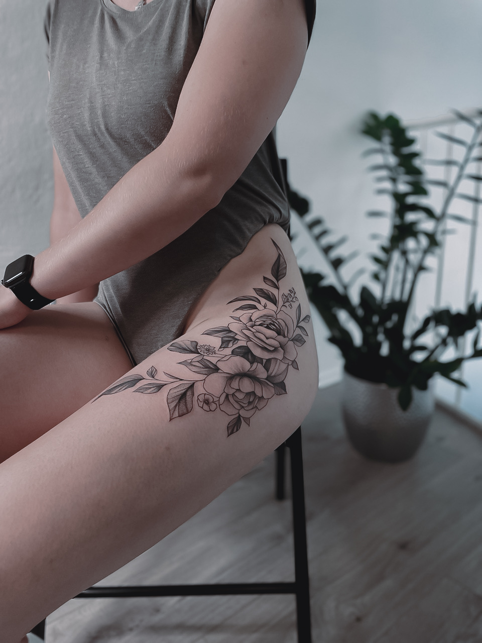 #Tätowierung #Fineline #Hüfte #Pfingstrosen #Bein