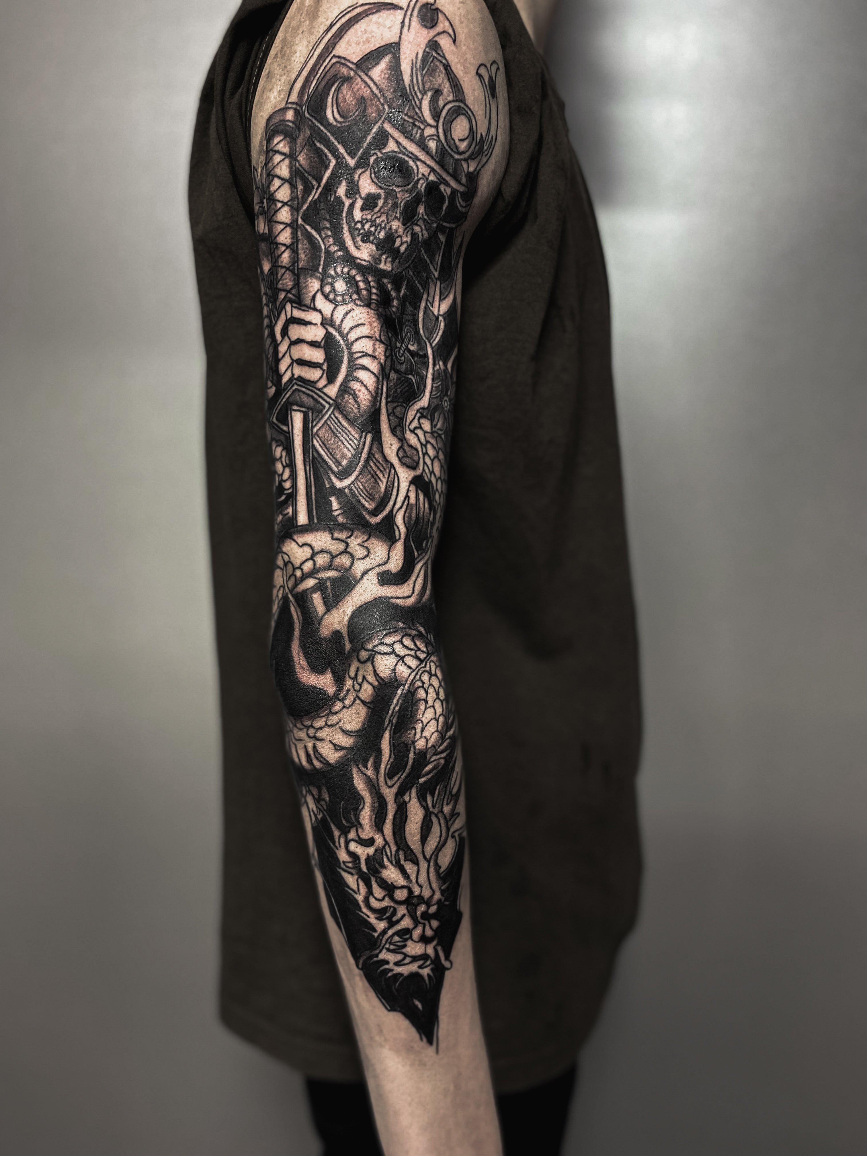 Hallo, mein Name ist Kristyan, ich bin Tätowierer aus der Ukraine. Ich tätowiere ungefähr seit zwei Jahren. In Tattoos habe ich eine Manifestation meiner Kreativität gefunden. Ich freue mich sehr, wenn meine Skizzen für den Kunden begehrenswert werden. Ich arbeite sehr gerne im grafischen Stil. Seit einigen Jahren ist dieser Stil besonders populär geworden ist, insbesondere in Kombination mit einem Punk-Thema.