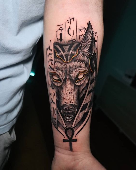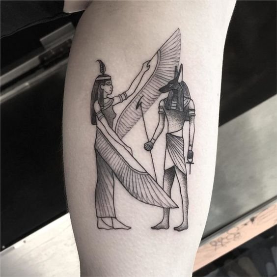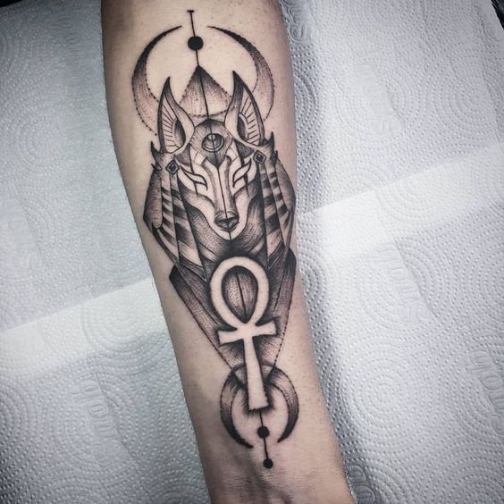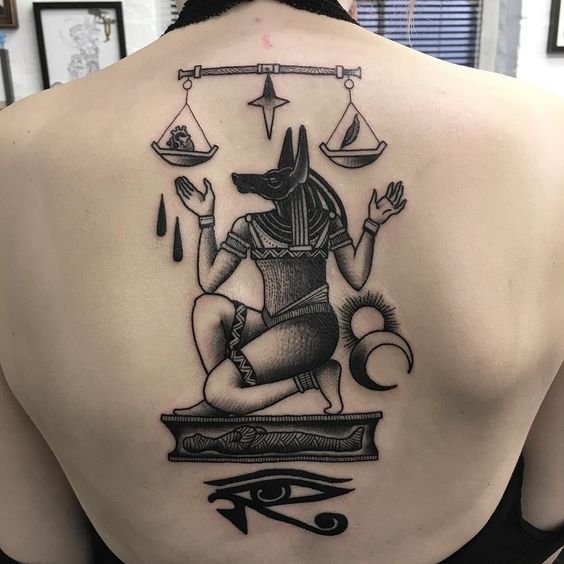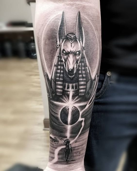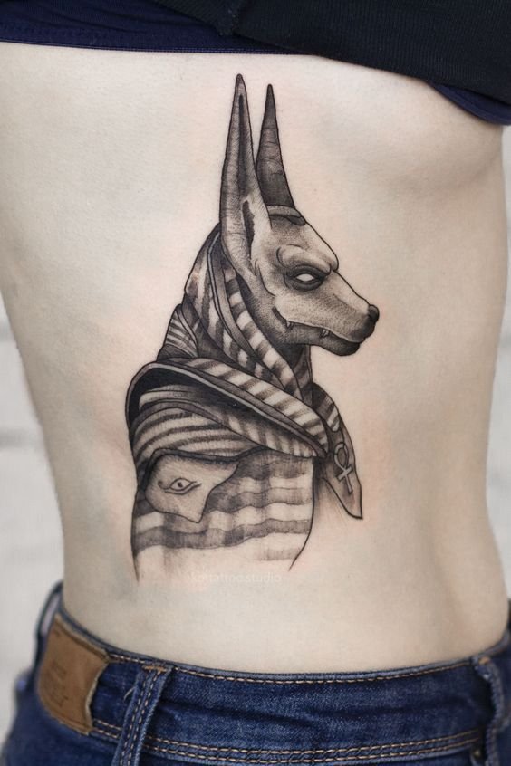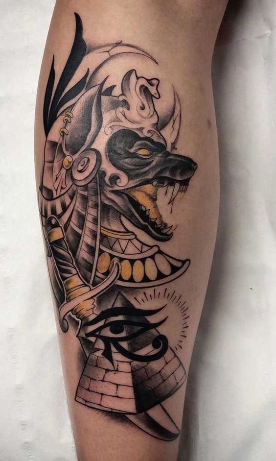 Anubis, der Sohn von Osiris, wird auch als Schutzpatron der Apotheker angesehen und begleitet die Toten in die andere Welt. Daher symbolisiert ein Tattoo mit seinem Bild oft die Vorstellung von einem Gott, der den Weg öffnet.