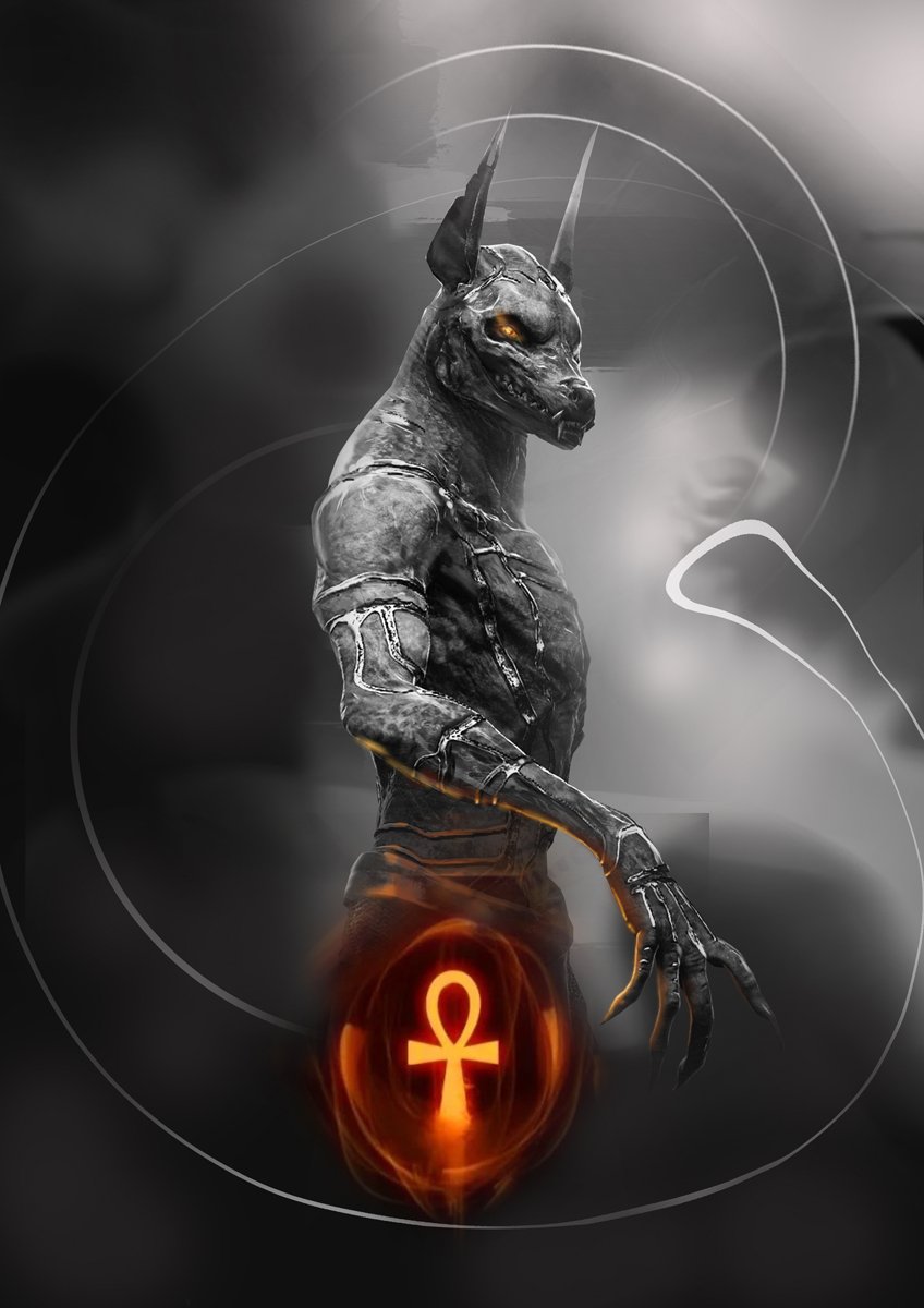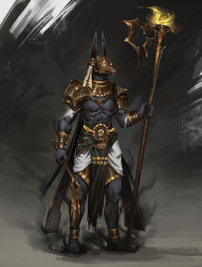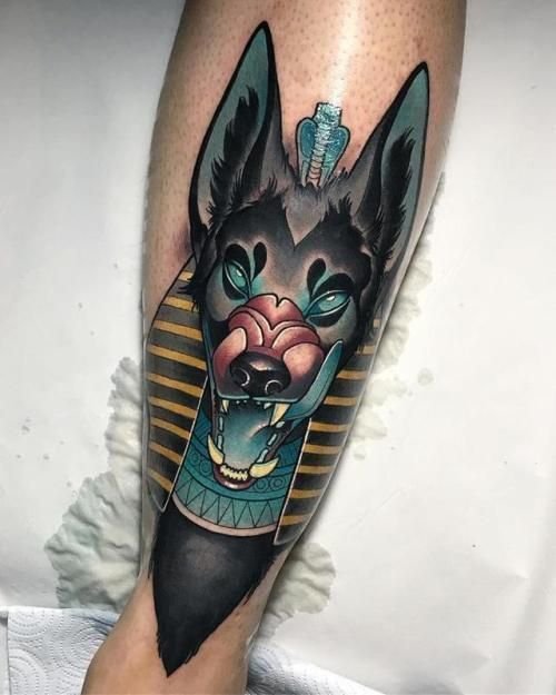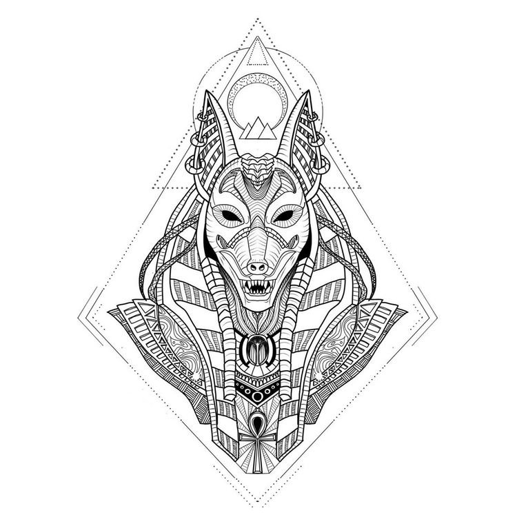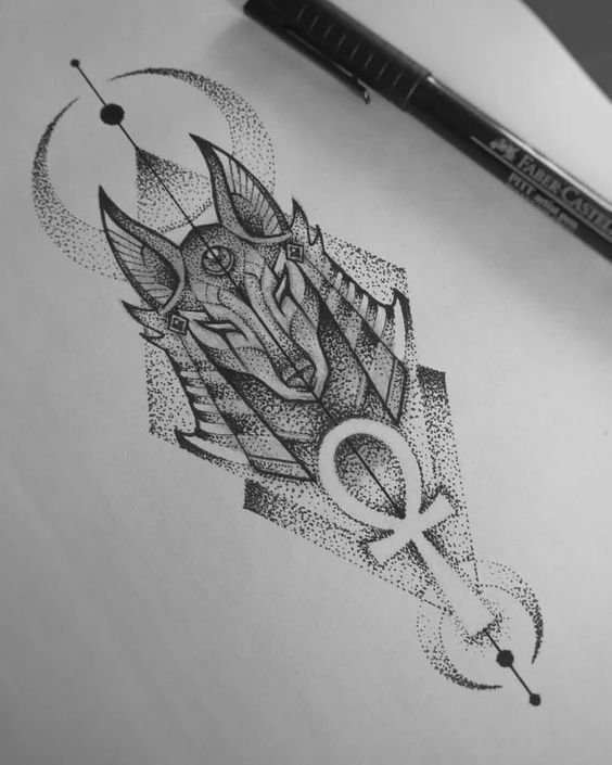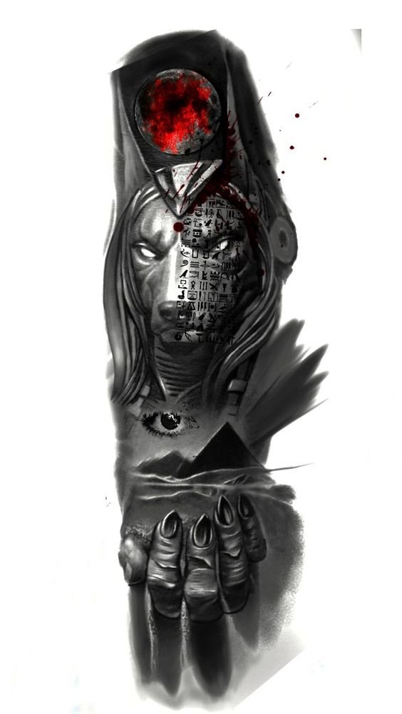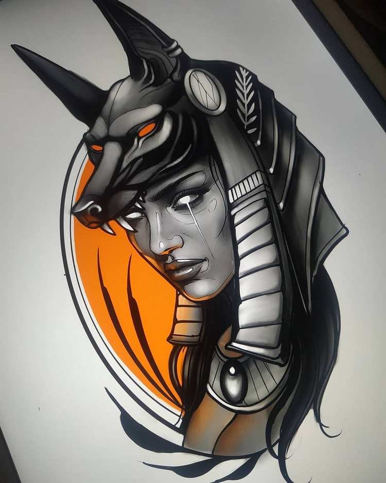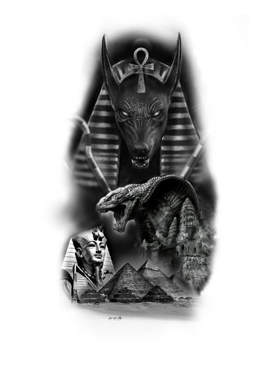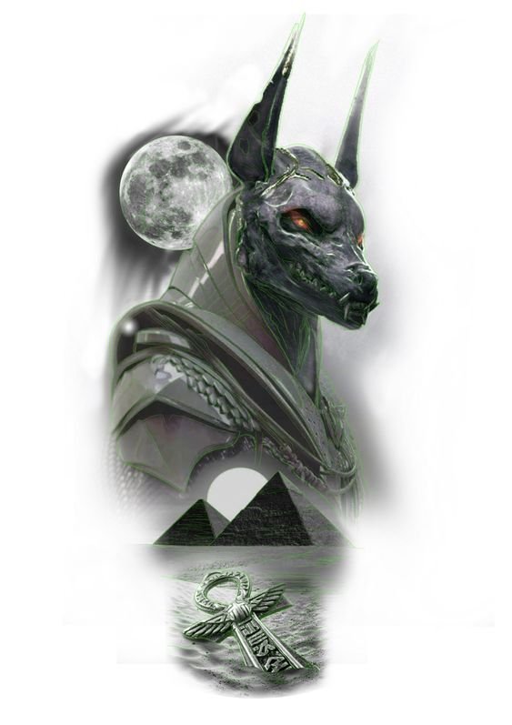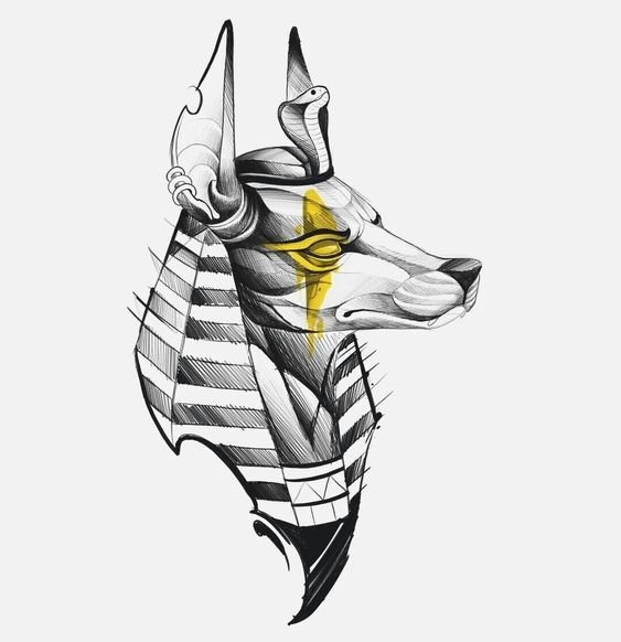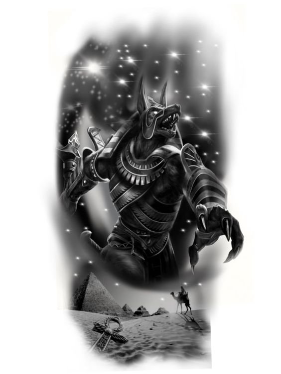 In Tattoo-Designs wird Anubis normalerweise mit dem Körper eines Mannes und dem Kopf eines Schakals oder eines Hundes dargestellt. In den Skizzen von Anubis dominieren grundsätzlich drei Farben: