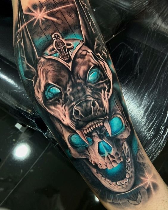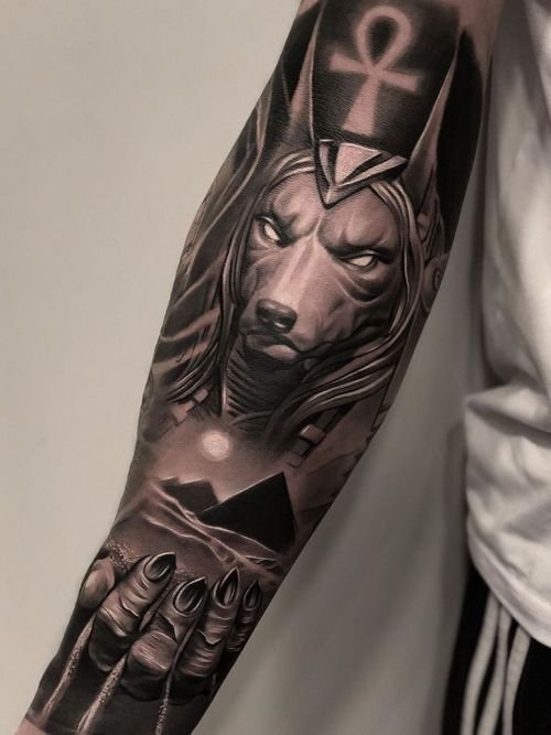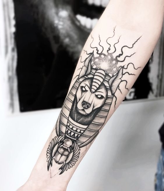 Was bedeutet das Anubis-Tattoo? In der Mythologie gilt diese Gottheit als die geheimnisvollste aller Götter. Anubis ist der Schutzpatron des Jenseits und begleitet die Seelen der Verstorbenen. Er ist der Patron von Nekropolen und Friedhöfen und einer der Hauptrichter im Totenreich. Aufgrund dieser Assoziationen glauben viele, dass ein Tattoo mit seinem Bild Probleme in das Leben seines Trägers bringen könnte. Trotz dieser düsteren Konnotationen wird ein Tattoo, das Anubis repräsentiert, nicht als schlechtes Omen angesehen.