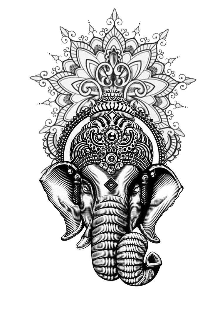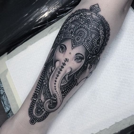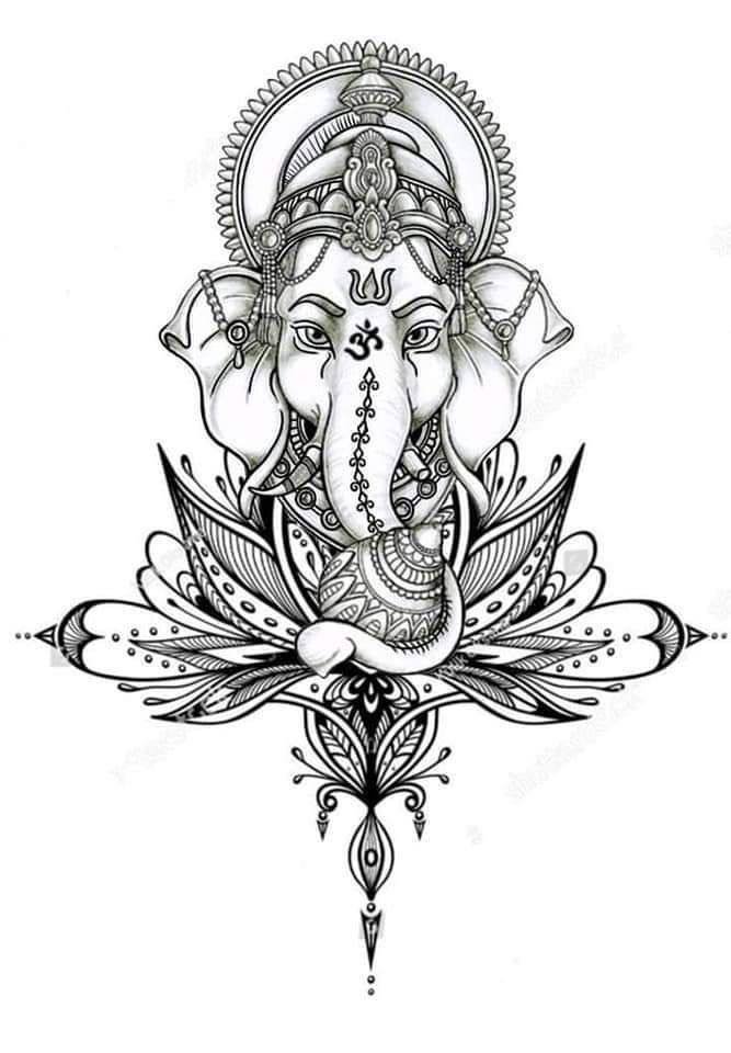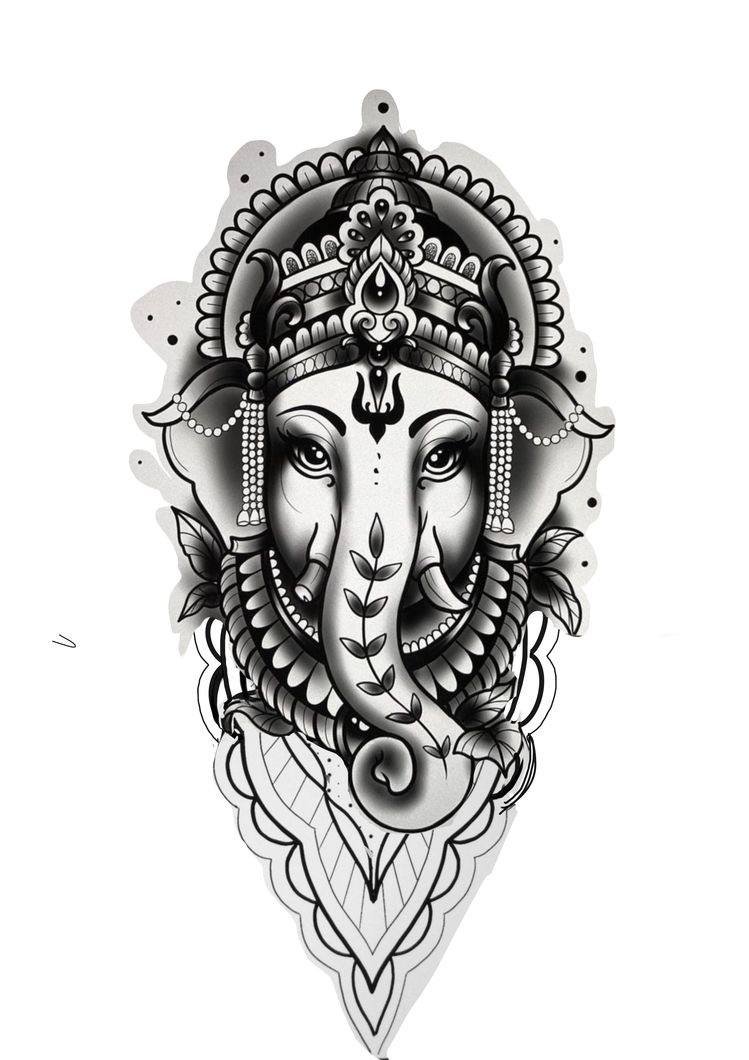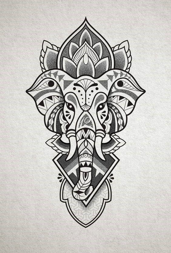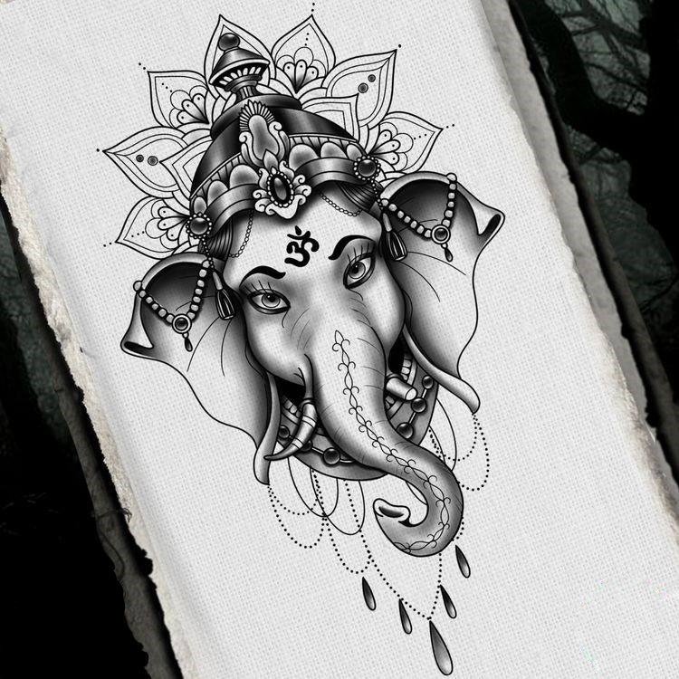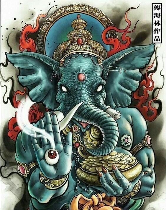 Sie sind die Reittiere der Götter. Indra - der König aller Götter und der Herrscher des Himmelreichs, er ist auf einem Elefanten gezeichnet. Die häufigste Ausführung des indischer Elefant im Tattoo-Bereich ist das Gesicht einer Gottheit namens Ganesha. Es ist mit einem großen Menschenkörper, einem Elefantenkopf und vier oder mehr Händen dargestellt. In den Bildern kann Ganesha ein bis sechzehn Paar Hände haben. In Tattoo bezeichnet man jedoch eine Gottheit mit nur zwei Paar Händen, die ein folgendes Zeichen trägt: emotionale Glückseligkeit, Wohlbefinden, Ablehnung der Reinkarnation und Erfüllung von Verpflichtungen.