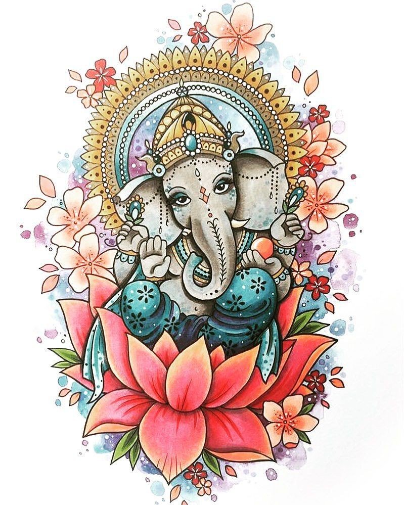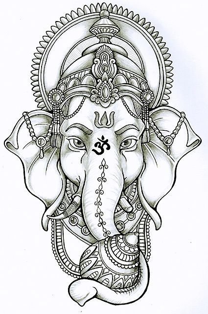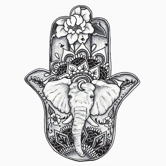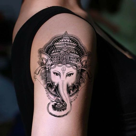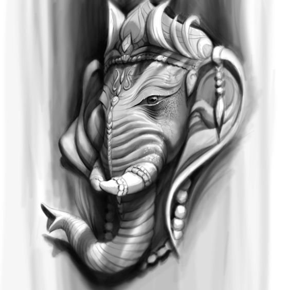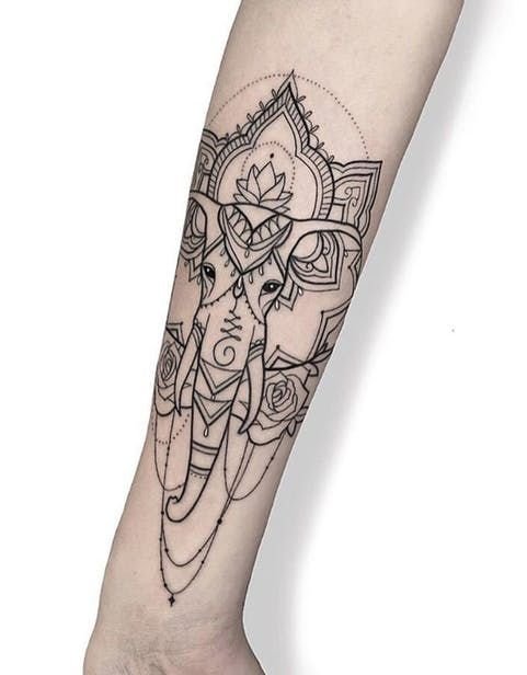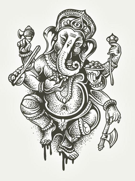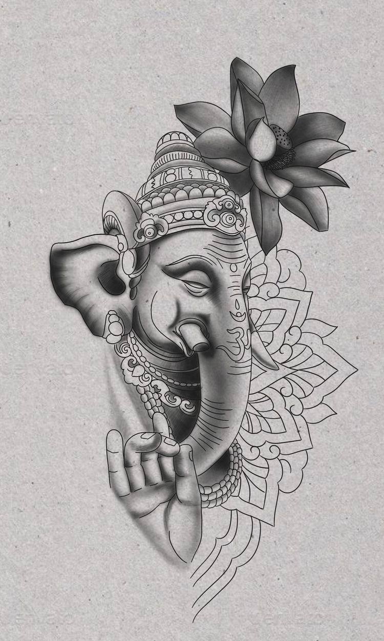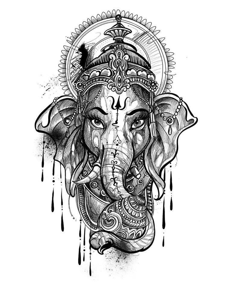 Sie sind die Reittiere der Götter. Indra - der König aller Götter und der Herrscher des Himmelreichs, er ist auf einem Elefanten gezeichnet. Die häufigste Ausführung des indischer Elefant im Tattoo-Bereich ist das Gesicht einer Gottheit namens Ganesha. Es ist mit einem großen Menschenkörper, einem Elefantenkopf und vier oder mehr Händen dargestellt. In den Bildern kann Ganesha ein bis sechzehn Paar Hände haben. In Tattoo bezeichnet man jedoch eine Gottheit mit nur zwei Paar Händen, die ein folgendes Zeichen trägt: emotionale Glückseligkeit, Wohlbefinden, Ablehnung der Reinkarnation und Erfüllung von Verpflichtungen.