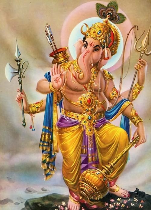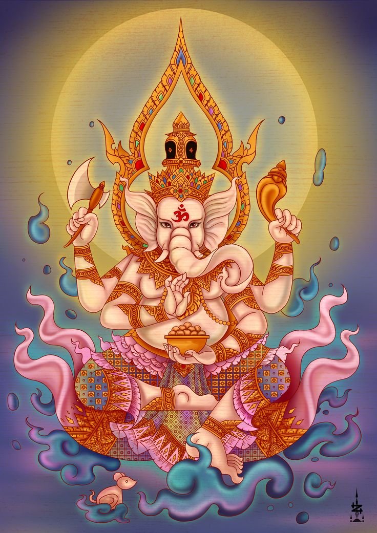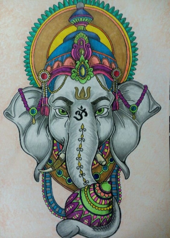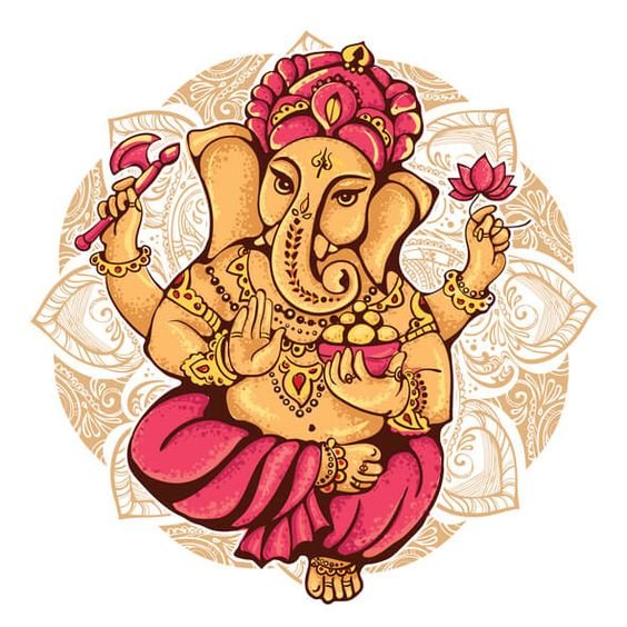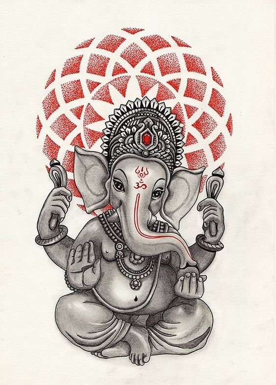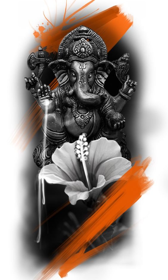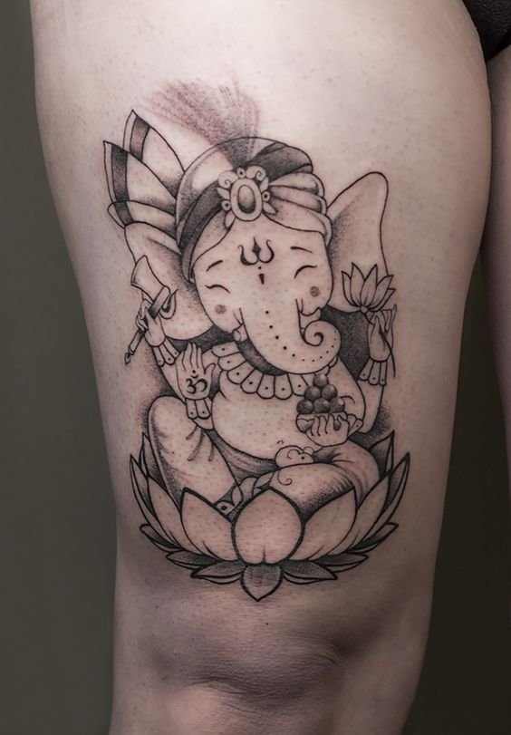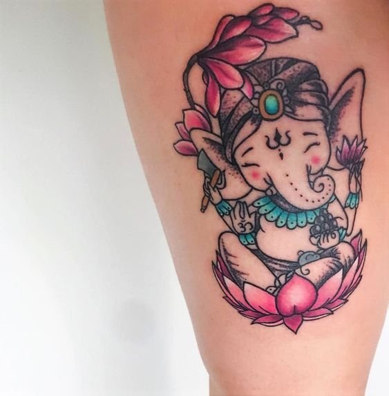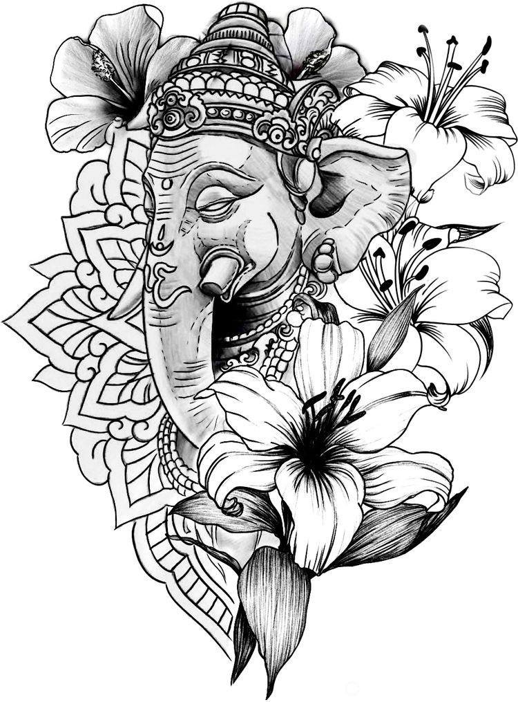 Sie sind die Reittiere der Götter. Indra - der König aller Götter und der Herrscher des Himmelreichs, er ist auf einem Elefanten gezeichnet. Die häufigste Ausführung des indischer Elefant im Tattoo-Bereich ist das Gesicht einer Gottheit namens Ganesha. Es ist mit einem großen Menschenkörper, einem Elefantenkopf und vier oder mehr Händen dargestellt. In den Bildern kann Ganesha ein bis sechzehn Paar Hände haben. In Tattoo bezeichnet man jedoch eine Gottheit mit nur zwei Paar Händen, die ein folgendes Zeichen trägt: emotionale Glückseligkeit, Wohlbefinden, Ablehnung der Reinkarnation und Erfüllung von Verpflichtungen.