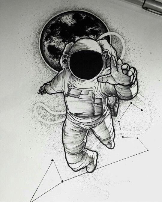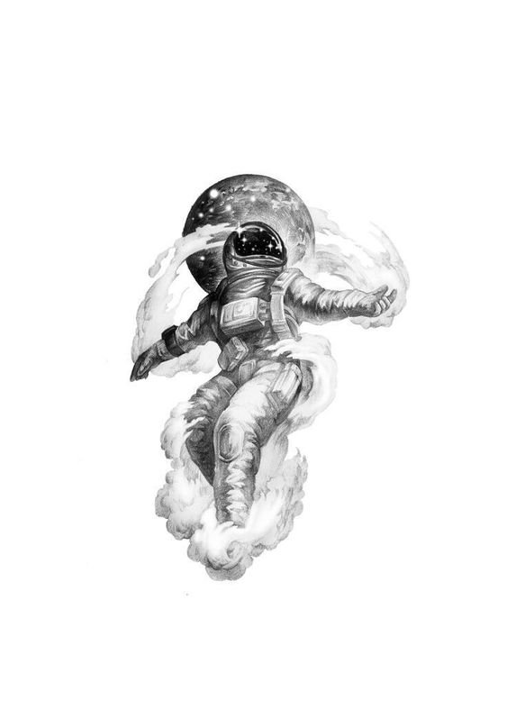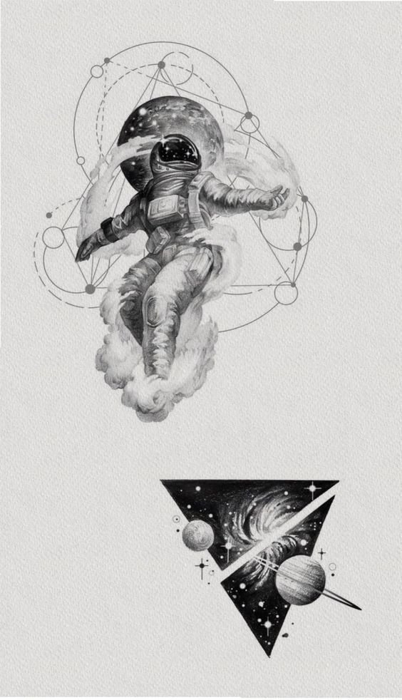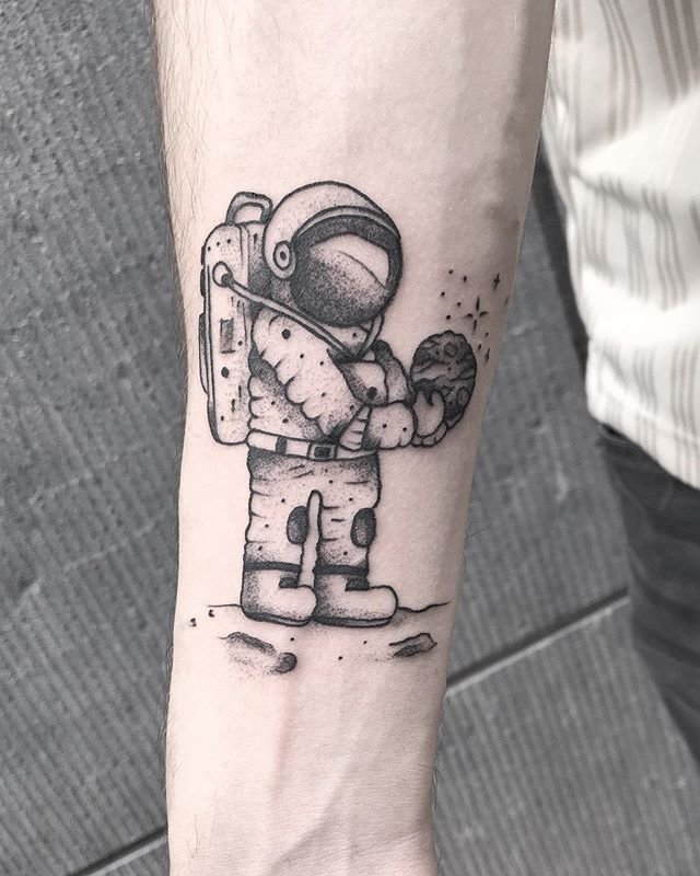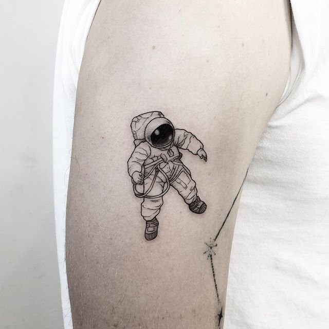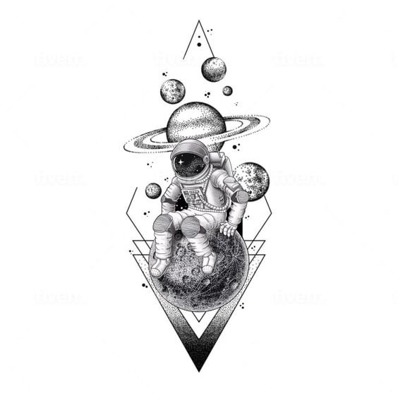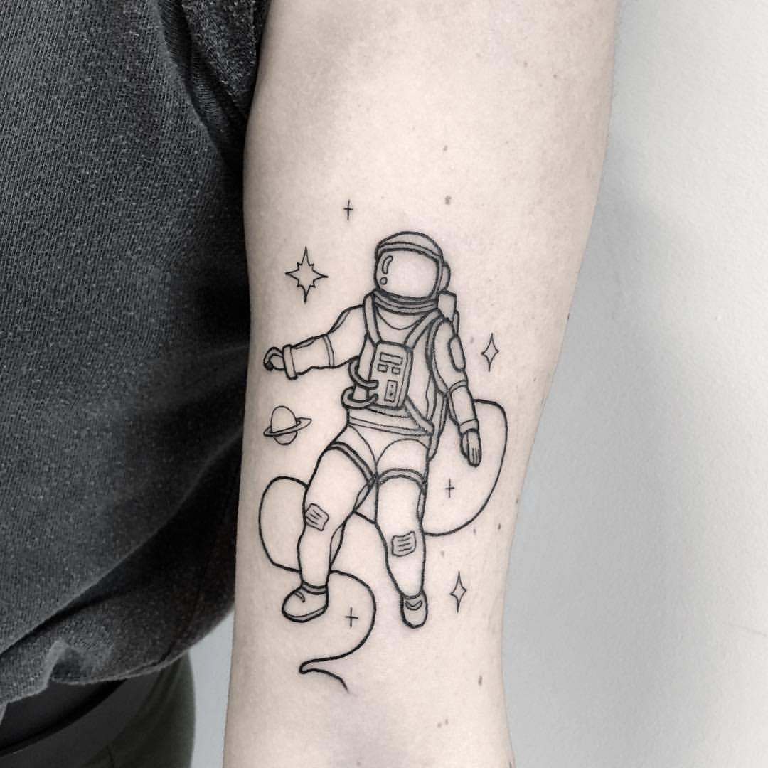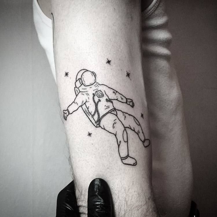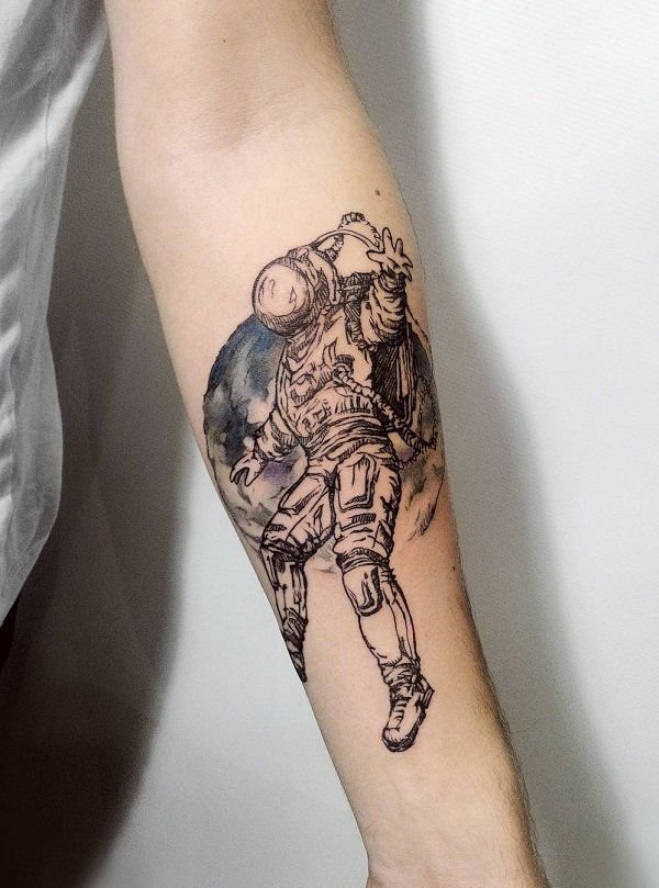 Eine der attraktiven Möglichkeiten für ein Tattoo ist eine Zeichnung in Form eines Raumfahrers oder Astronauten.