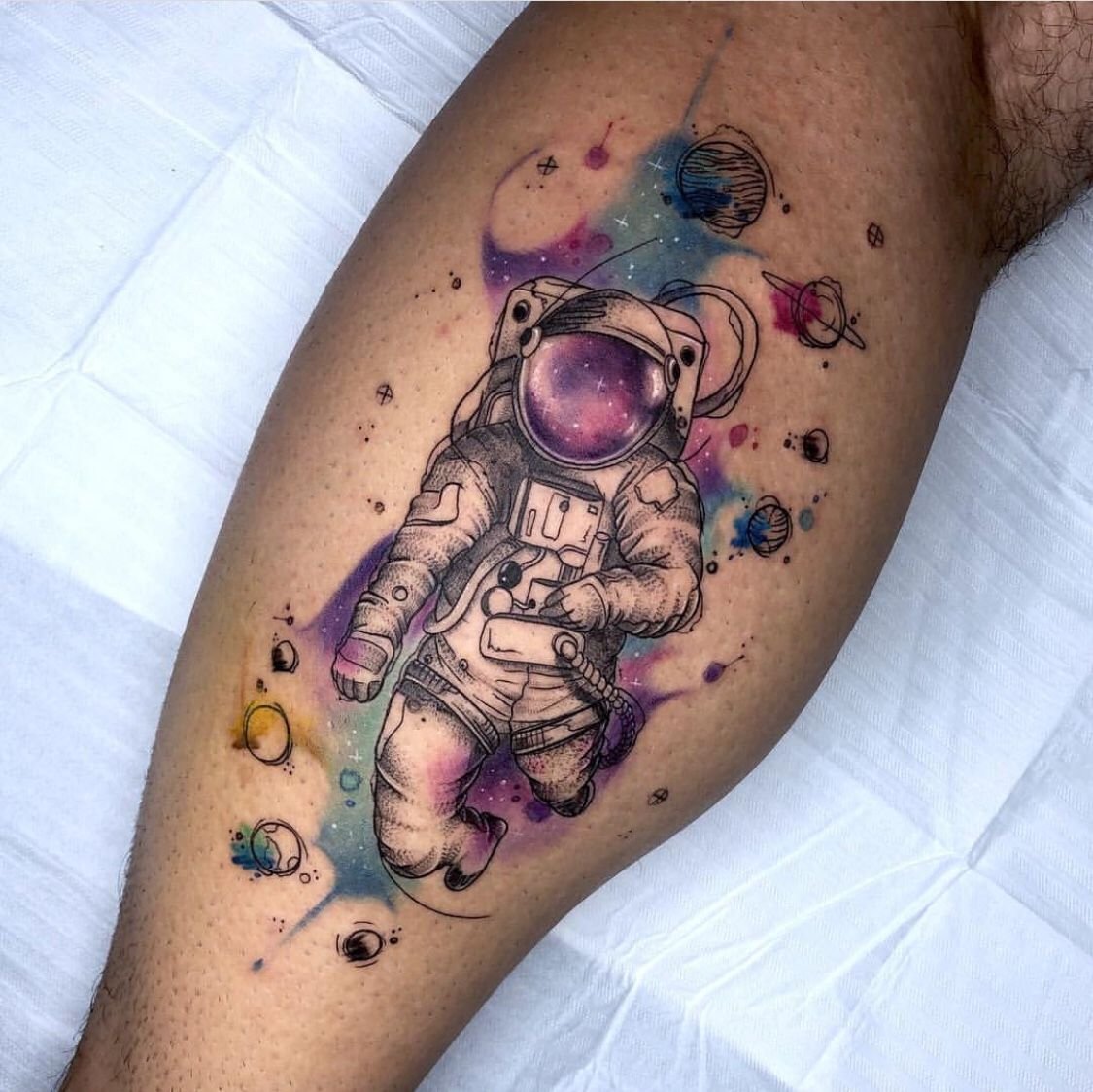 Astronaut-Tattoo in Form eines kleinen Tieres in leuchtenden Farben und Aquarell Tattoo-Stil ist eine gute Wahl für kreative Frauen.