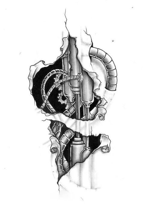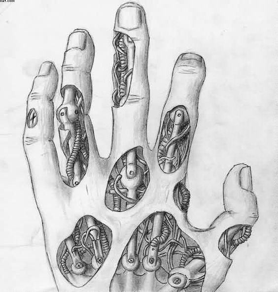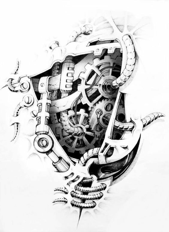 In der Regel sehen Skizzen so aus: Auf dem menschlichen Körper wird eine zerrissene Haut dargestellt, durch die der Mechanismus sichtbar ist. Alle Komponenten des Mechanismus (Muttern, Drähte, Federn, Kolben, Bolzen usw.) sehen sehr natürlich aus. Was gibt dem Stil ein besonderes Highlight.