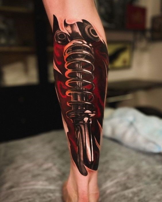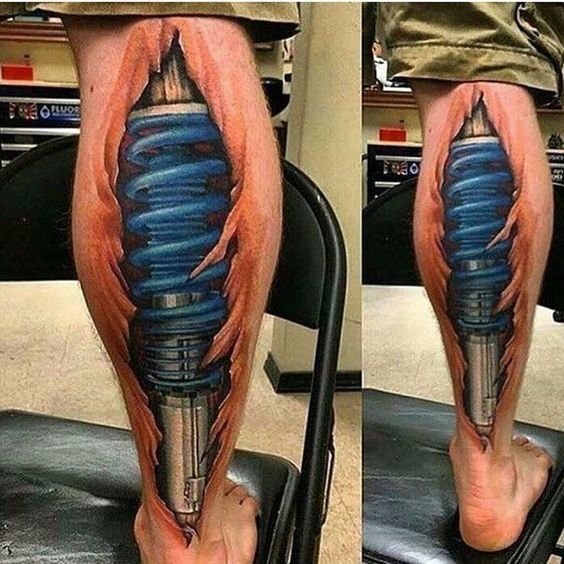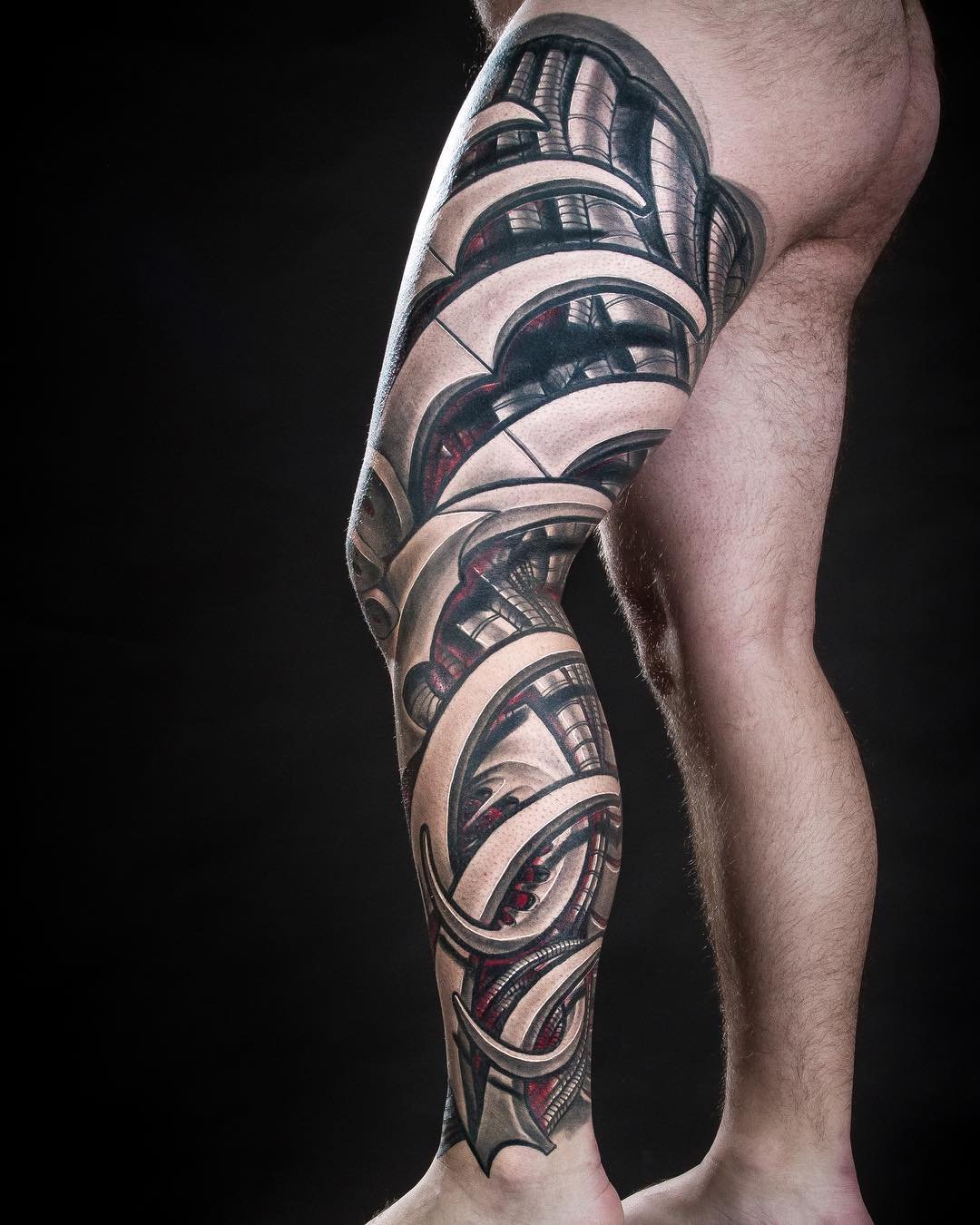 Auf den Beinen sind häufig biomechanische Tattoos zu sehen. Frauen bevorzugen diese Art von Tattoos oft an ihren Hüften, während Männer ihre Unterschenkel damit verzieren. In der männlichen Variante sind die Mechanismen größer und die Muskeln werden deutlich betont.