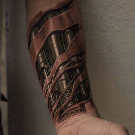Tattoos im Biomechanik-Stil werden oft am Unterarm platziert, was ihnen eine dynamische Wirkung verleiht, da sich die Hand ständig bewegt.
