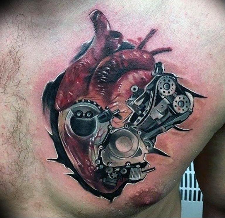 Besonders beeindruckend wirken biomechanische Tattoos auf der Brust, wenn der Mechanismus des Herzens dargestellt wird. Oft wird das Herz selbst aus mechanischen Teilen gebildet und ist verschlossen. Dieses Bild symbolisiert eine unglückliche Liebe, da das Herz des Tätowierten nun vor der Welt verborgen ist.