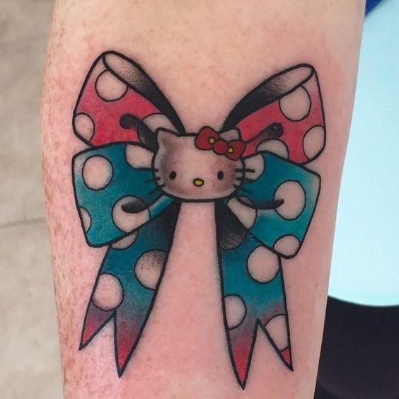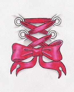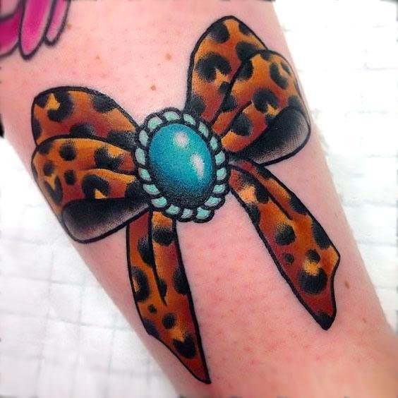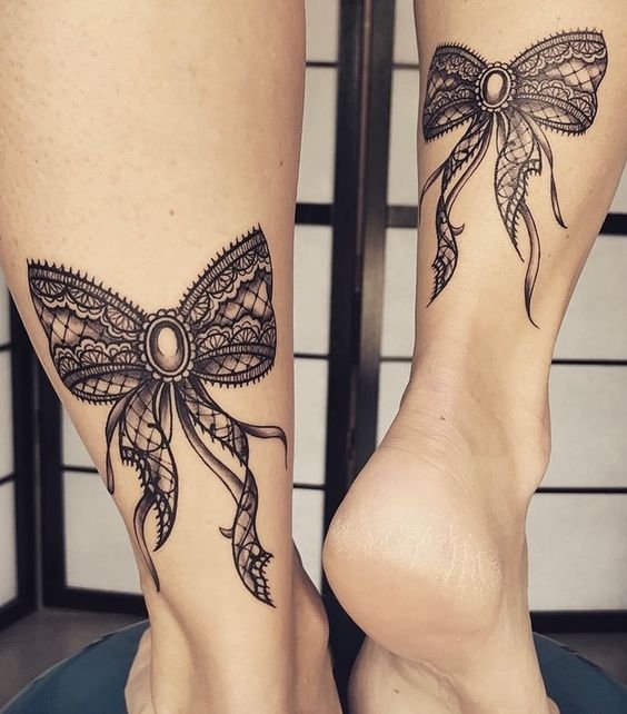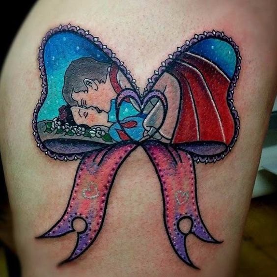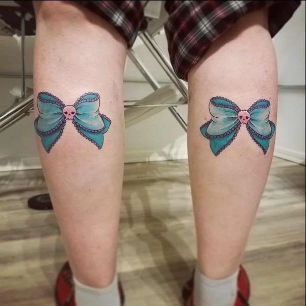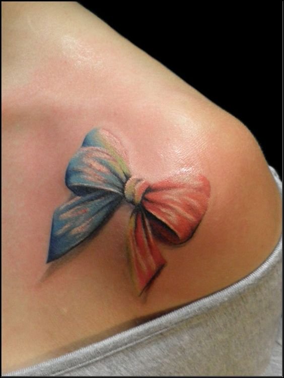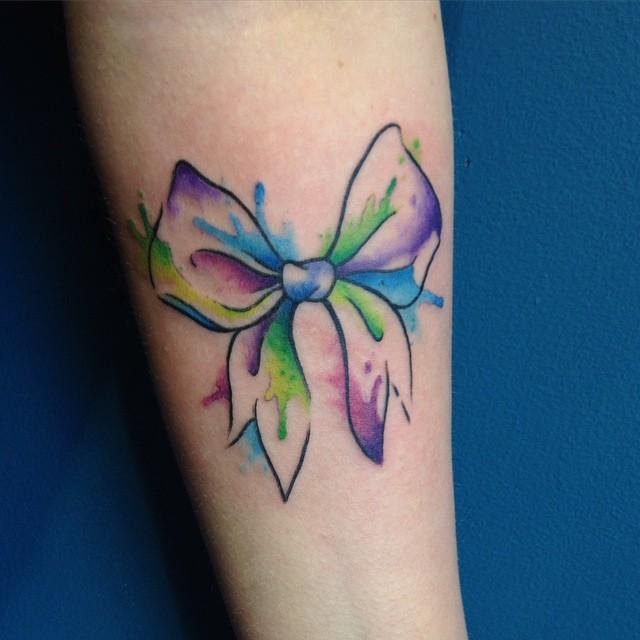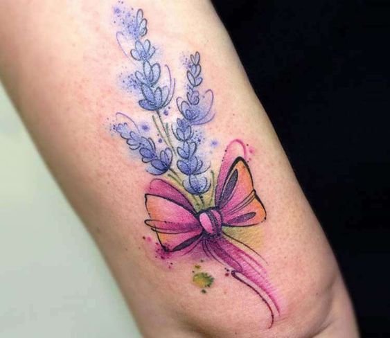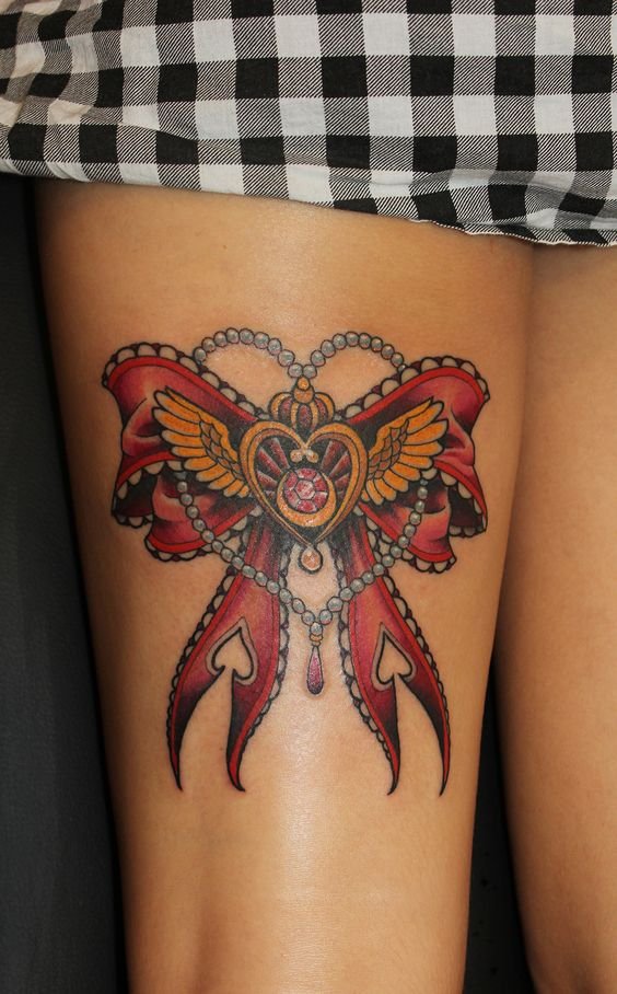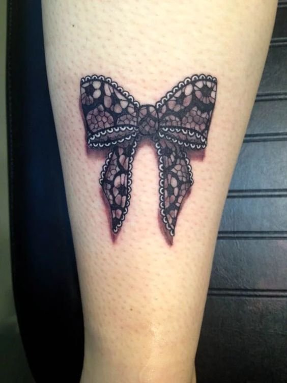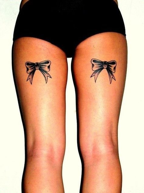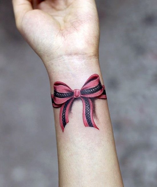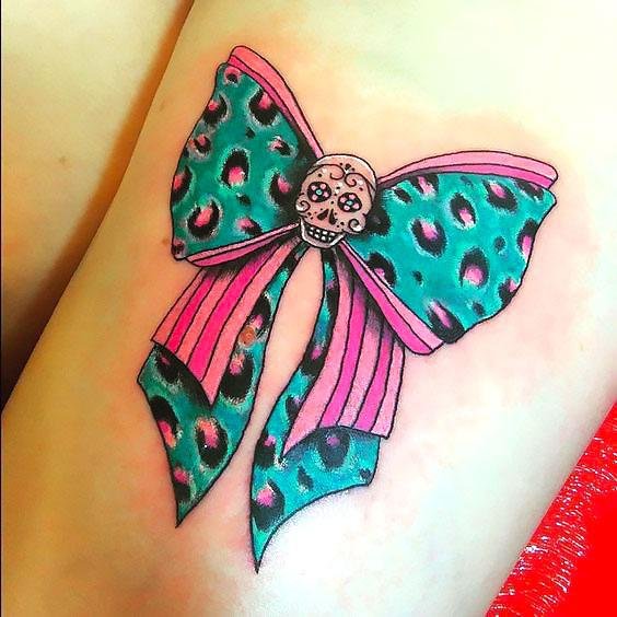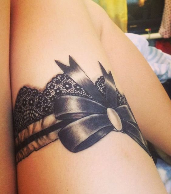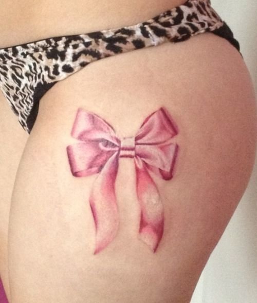 Ein Schleife in einem Tattoo kann in verschiedenen Formen, in beliebigen Farben, in verschiedenen Größen und an verschiedenen Körperteilen ausgeführt werden. Dieses Bild auf dem weiblichen Körper spricht vor allem von Zärtlichkeit und Schönheit und fügt seinem Besitzer einen Hinweis auf Sexualität hinzu.