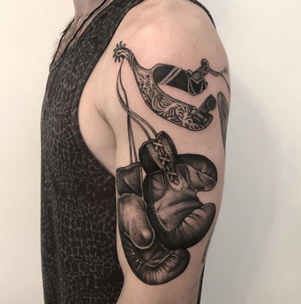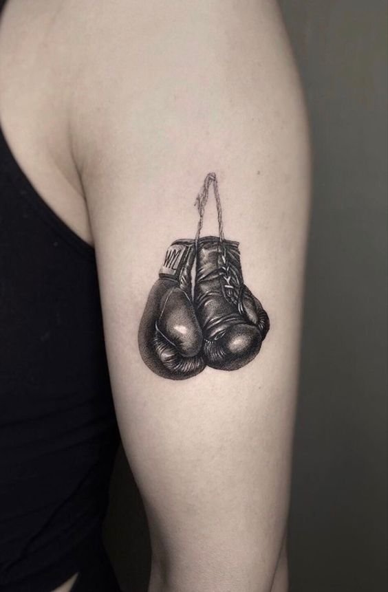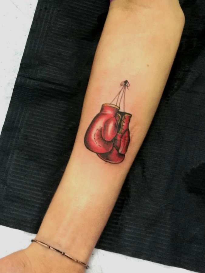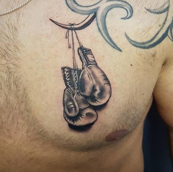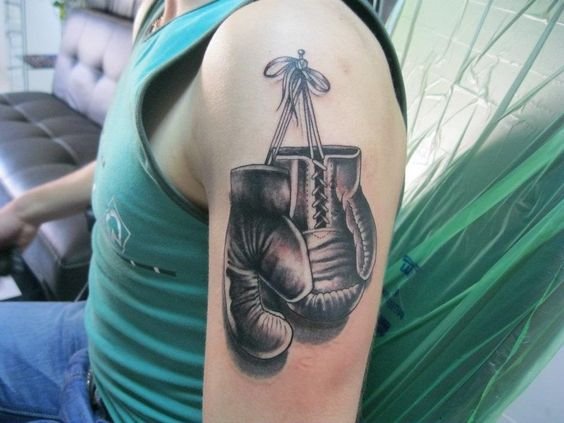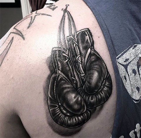 Das Boxhandschuh-Tattoo ist eines der wenigen Designs, dass die Rangliste der Sport-Tattoos anführt. Die Handschuhe selbst können entweder in Schwarz-Weiß oder in Farbe gestaltet werden. Die Wahl dieser Zeichnung ist sehr wichtig-schließlich spricht er über seine innere Welt und seinen Lebensstil und unterstreicht auch seine Leidenschaft für Sport. Wenn ein Mensch diese Tätowierung wählt, bedeutet das, dass er seine starken Qualitäten zeigen und seinen willensstarken und kämpferischen Charakter demonstrieren möchte.