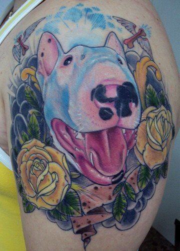 - Power - Der Bullterrier hat einen muskulösen und kräftigen Körperbau, das Tattoo mit seinem Image spiegelt den Besitzer des Tattoo als starke Persönlichkeit wider;