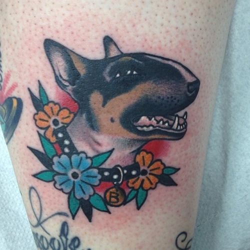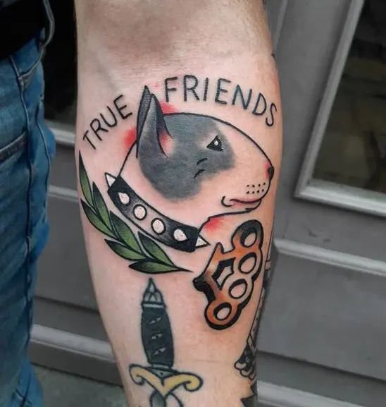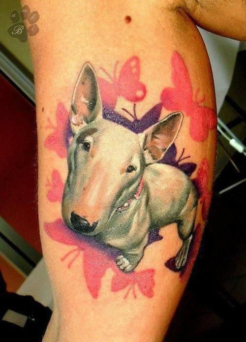 Diese Rasse zeigt keine Aggression ohne Grund und ist auch nicht gern alleine. Das Bullterrier-Tattoo ist mit der folgenden Notation gefüllt: