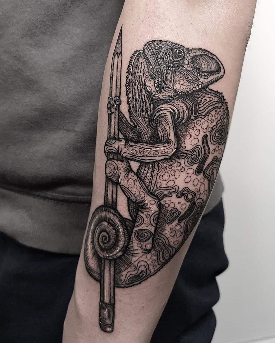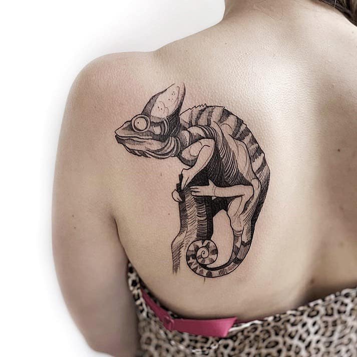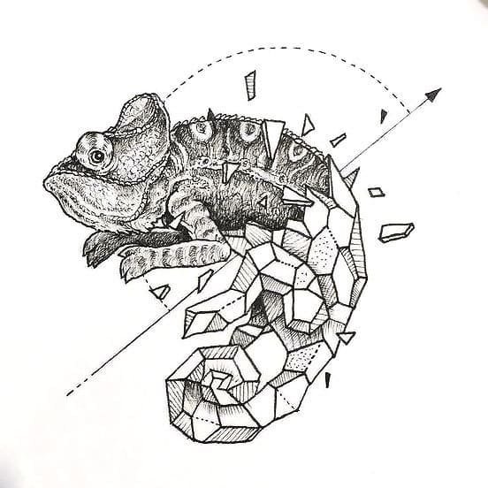 Der Gravurstil eignet sich auch für Chamäleon-Tattoos. In diesem Stil sieht das Chamäleon wie ein gezeichnetes Bild in einem Lehrbuch aus.