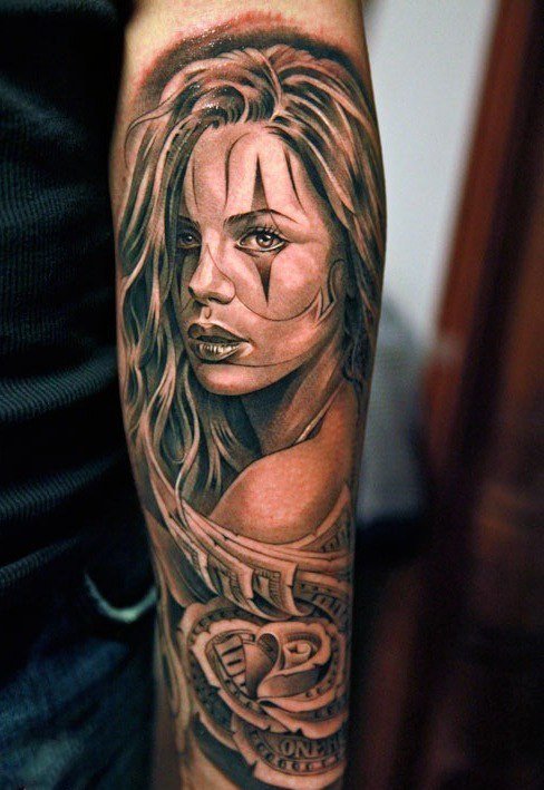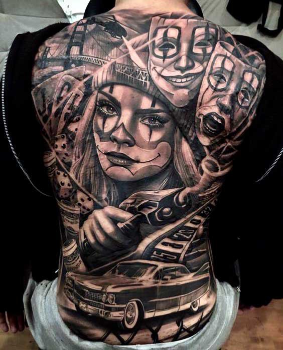 Chicano-Tattoos sehen auf großen Teilen des Körpers wie Rücken, Brust, oberer Teil des Beines, Unterarm, Bauch spektakulär aus.