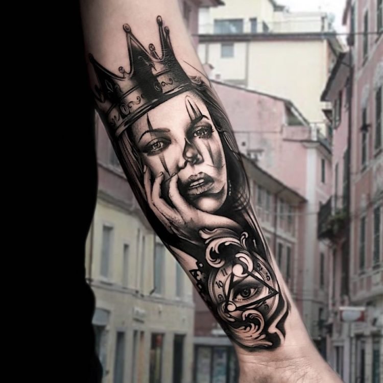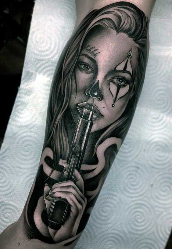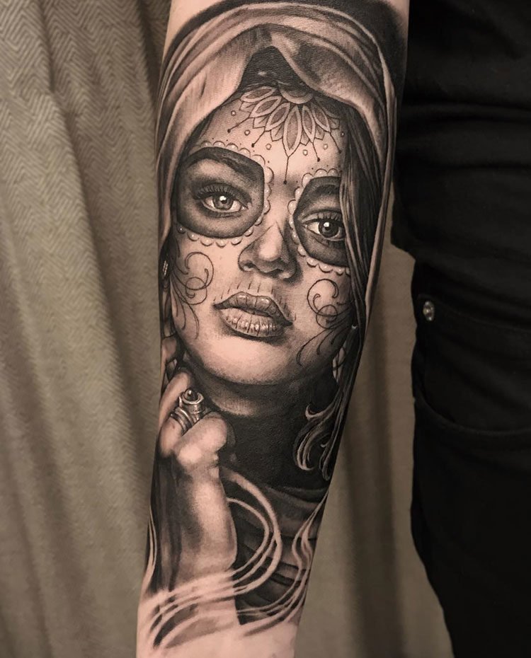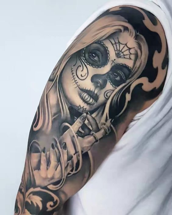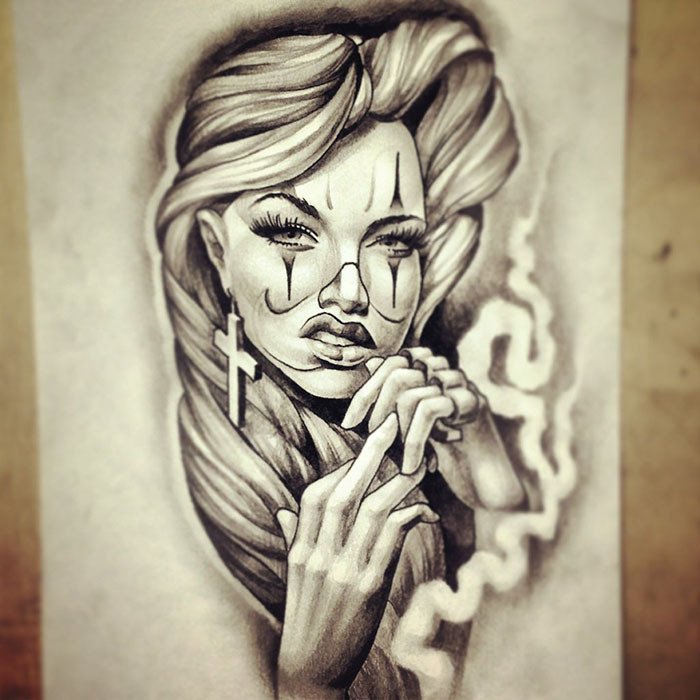 Nicht nur Männer, sondern auch Frauen entscheiden sich dafür, sich dieses Bild auf den Körper tätowieren zu lassen. Seltsamerweise entscheiden sich auch viele Frauen dafür, ihren Körper mit attraktiven Bildern im Chicano-Stil zu tätowieren, die spektakulär dekorativ sind und dem Bild eine gewisse Mystik verleihen.