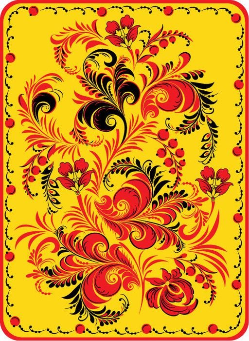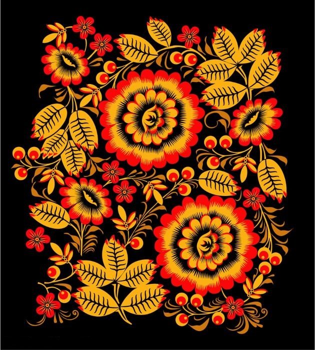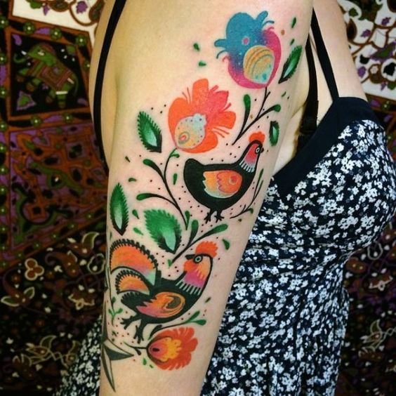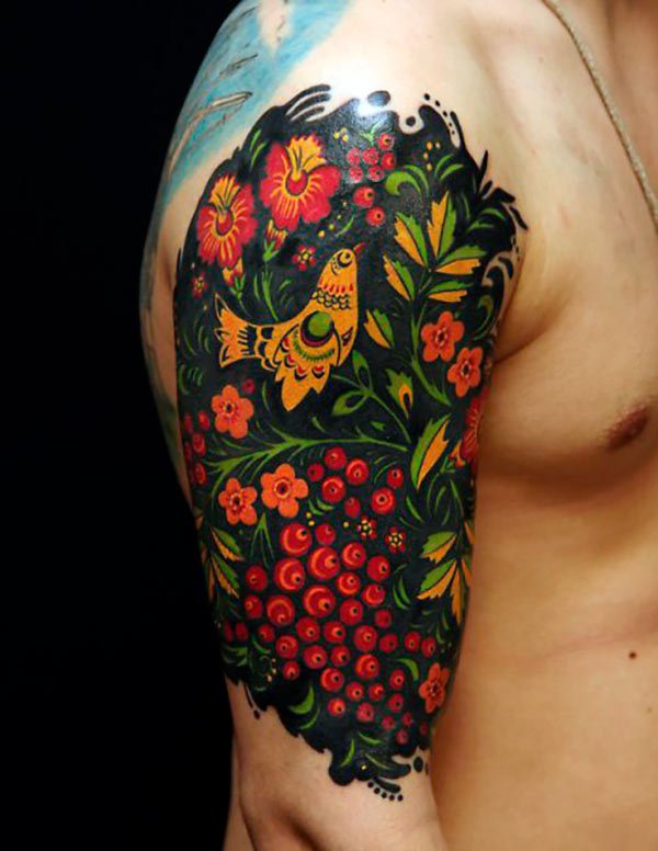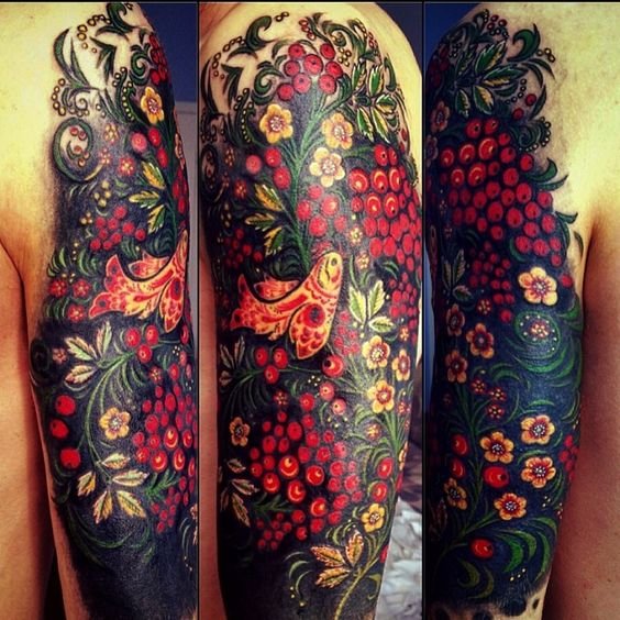 Diese drei Farben sind die Hauptfarben in Chochloma, dies bedeutet jedoch nicht, dass andere Farben nicht verwendet werden können. In Chochloma-Stil herrschen häufig Grüntöne vor. Es ist zu erwähnen, dass die Bedeutung der Chochloma-Malerei nicht nur vom Farbverhältnis, sondern auch von den darin enthaltenen Elementen abhängt. Oft ist ein Bild von goldenen Blumen, die ein Zeichen der Erhellung und des Wissens sind, zu treffen. Eberesche, oder besser gesagt ihre Trauben, ist weibliche Schönheit und Jugend. Man trägt auch oft einen Feuervogel auf, der ein Zeichen für langes Leben, Zyklizität und Unsterblichkeit ist. Ursprünglich wurde Chochloma zum Malen verschiedener Gerichte verwendet, doch im Laufe der Zeit geriet diese Art von Kunst in den Tattoo-Bereich und erlangte große Popularität.