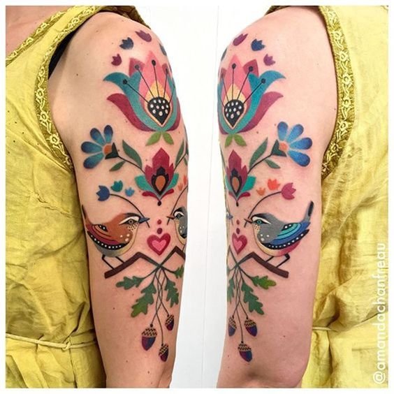 Auf kleinen Bereichen wird es schwierig sein, das Bild zu analysieren und zu verstehen, welche Bedeutung das Tattoo trägt. Chochloma-Zeichnungen auf kleinen Bereichen bleiben nur Zeichnungen, aber die voluminöse, farbenfrohe Malerei, in der der Kontrast zwischen all ihren Farben sichtbar ist, ist wirklich Chochloma. Achten Sie bei der Auswahl einer Stelle, an dem ein Tattoo aufgetragen wird, auf die Größe des Tattoos. Da Chochloma eine große Fläche benötigt, werden diese Körperteile für dieses Tattoo ausgewählt: Arm, Unterarm, Schulter, der gesamte Bereich des Arms, der Hüften, des Rückens und der Beine. Die Chochloma-Malerei wird sowohl auf Frauen- als auch auf Männerkörper gleichermaßen eindrucksvoll und originell aussehen.