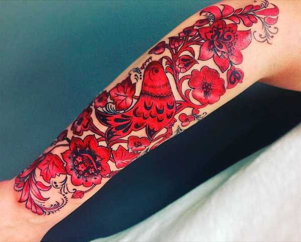 Ihre Bedeutung hängt direkt von der Farbe ab, in der sie ausgeführt werden. Chochloma Tattoos zeichnen sich nicht nur durch die vorherrschenden Hauptfarben aus, sondern auch durch ihre leuchtenden, saftigen Farben. Das blasse Bild wird nicht wie die Chochloma-Malerei aussehen, da Chochloma für seine satten Farben bekannt geworden ist.