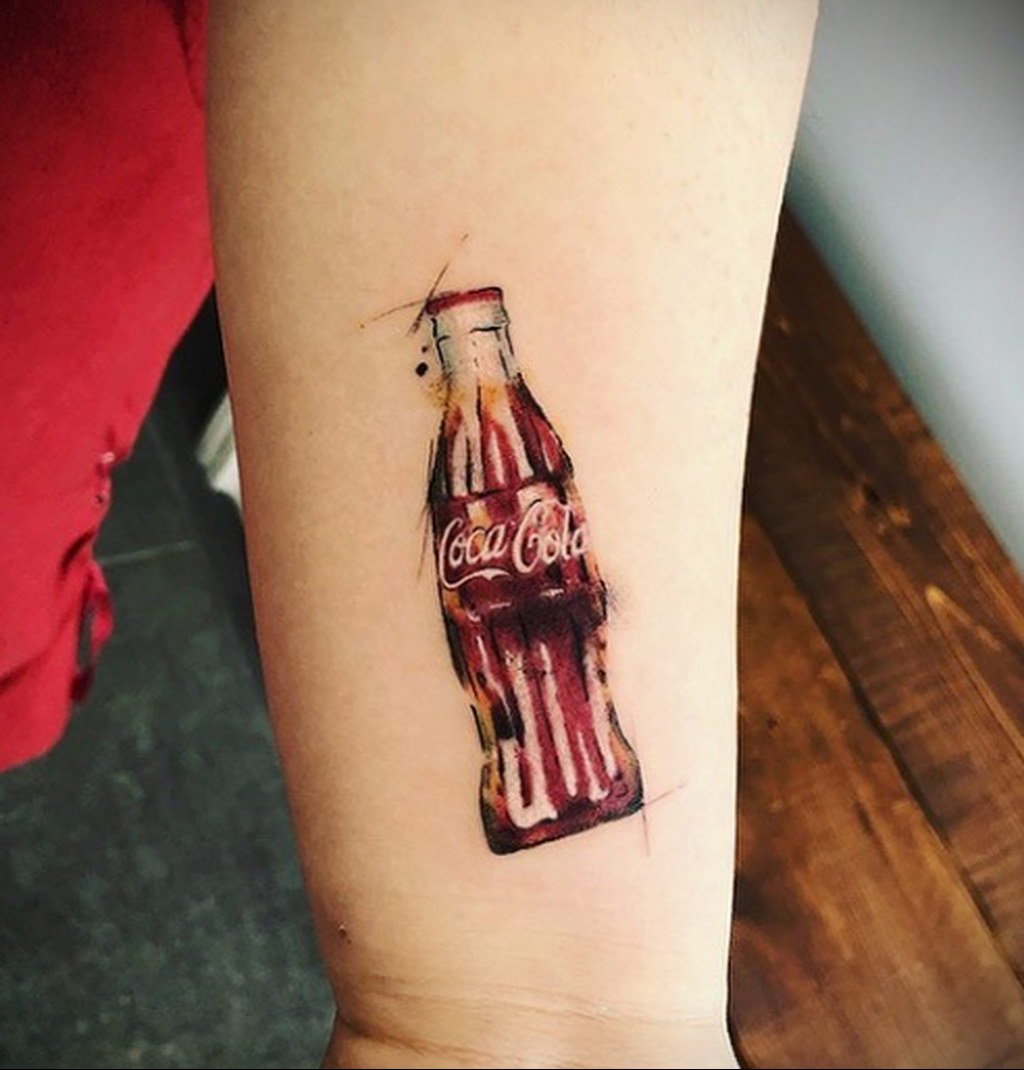 Das heißt, die Person, die den Coca-Cola-Sketch erhält, ist ein Fan des Getränks und unterstreicht damit ihre Zugehörigkeit zur Coca-Cola-Generation. Der Salon kann Hunderte von Optionen für eine solche Tätowierung empfehlen, wobei die Auswahl von einer gewöhnlichen Flasche bis hin zu einem Produkt reicht, das in ein Flugzeug, einen Geländewagen und so weiter verwandelt wurde.