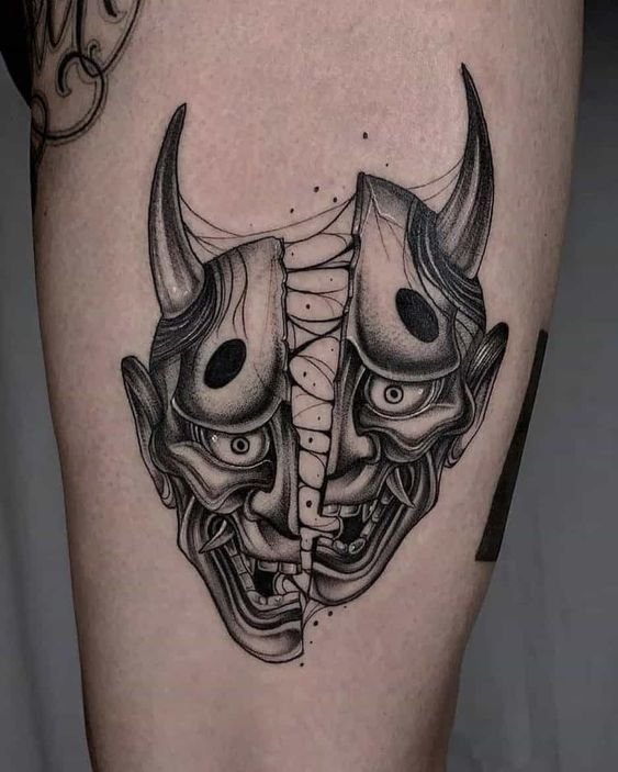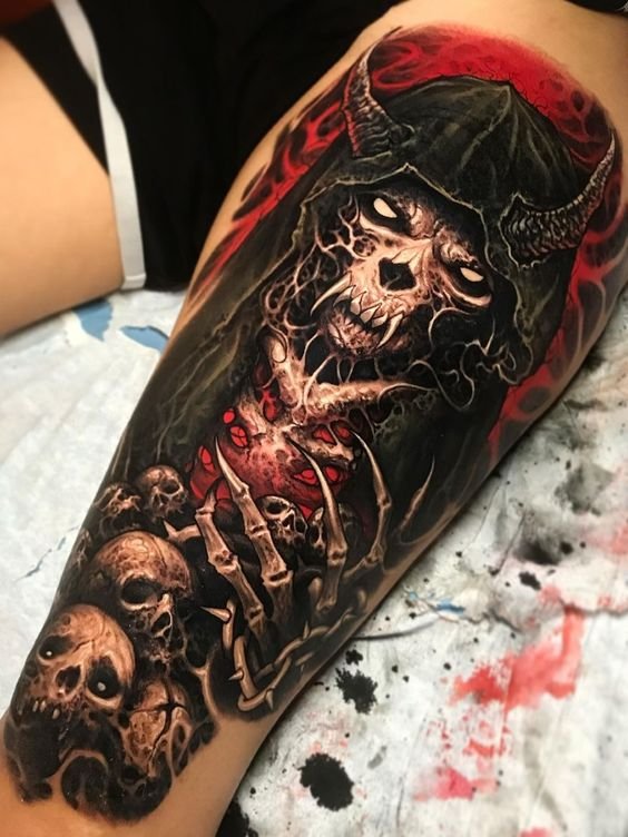 In diesen Tattoos wird oft eine dämonische Kreatur mit zerlumpten Flügeln, Hörnern und einem gegabelten Schwanz dargestellt. Der Dämon kann einen Schädel anstelle des Kopfes haben oder ein unheimliches tierähnliches Aussehen wie zum Beispiel einen Stier. Solche Designs werden hauptsächlich in den Farben Rot-Schwarz oder Schwarz-Weiß mit zusätzlichen Grau- und Brauntönen dargestellt.