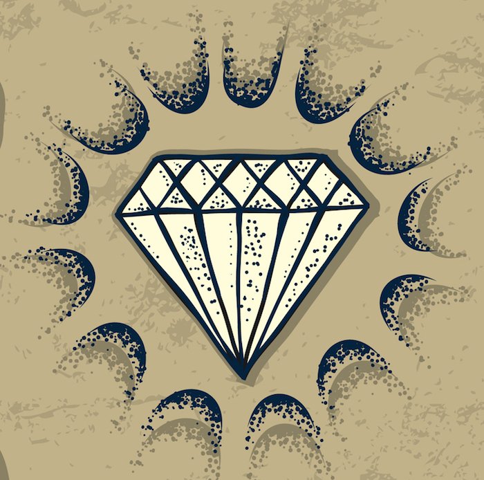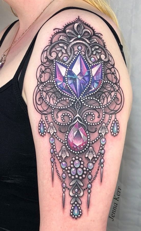 Die häufigsten Teile des Körpers, die das Bild eines Diamanten schmücken, sind Rücken, Arm, Handgelenk, Finger und Hände. Für Tattoo werden meistens Flieder-, Blau- und Rosatöne gewählt, häufig wird jedoch auch das Bild eines Diamanten in Schwarz gefunden. Ein Diamant kann entweder ein separates Bild oder mit zusätzlichen Elementen sein. Wenn wir alle Bezeichnungen eines Diamanten verbinden, erhalten wir folgendes Bild: