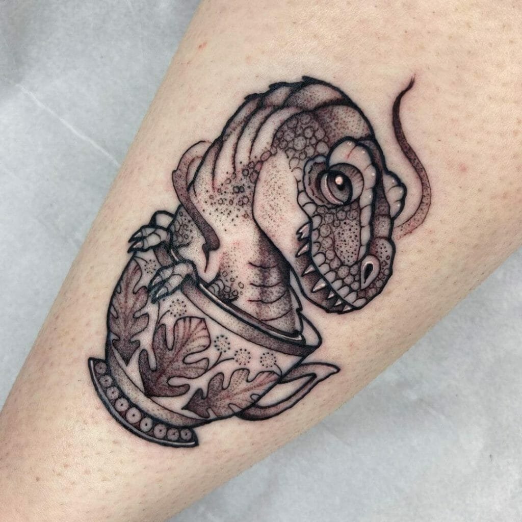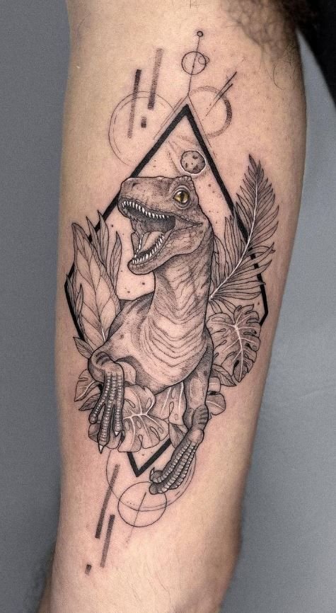 Wenn ein Dino -Tattoo in Form eines Monsters gemacht wird, zeigt es versteckte Aggression, den Wunsch, sich zu übertreffen. Das Tattoo wird zum Zeitpunkt des Angriffs in Form eines aggressiven Tieres gemacht. Andere Elemente können hier verwendet werden: Tiere, die vor ihm weglaufen, ein Opfer, und das Monster selbst ist mit langen Reißzähnen versehen, in vielen Fällen sogar übertrieben, leicht unrealistisch.