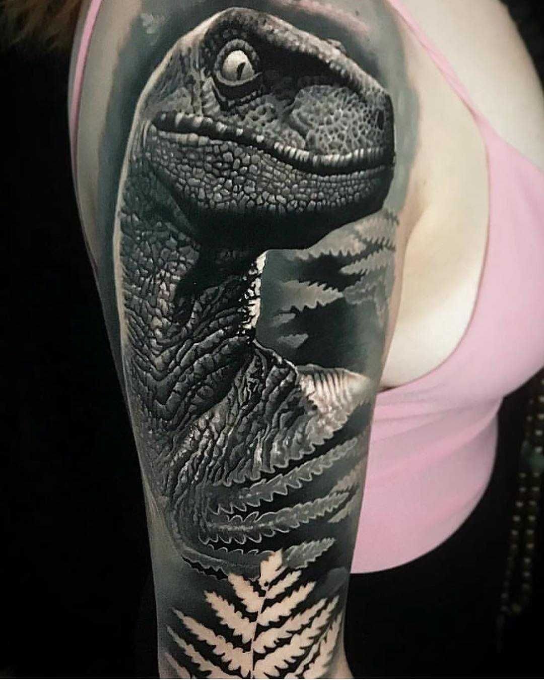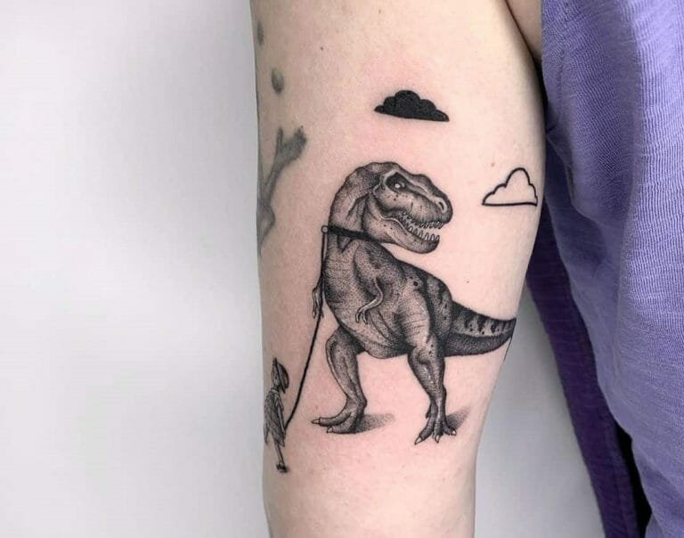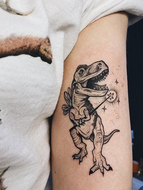 Es gibt viele interessante Beispiele für Godzilla, das furchterregende, zerstörerische Monster. Eine solche Tätowierung wird oft von Fans dieses Films angebracht. Eine interessante Lösung kann übrigens in einer Zeichnung bestehen, in der der Dino kleiner ist als der Mensch, so als wolle er andeuten, dass der Mensch nun an der Spitze der Nahrungskette steht.