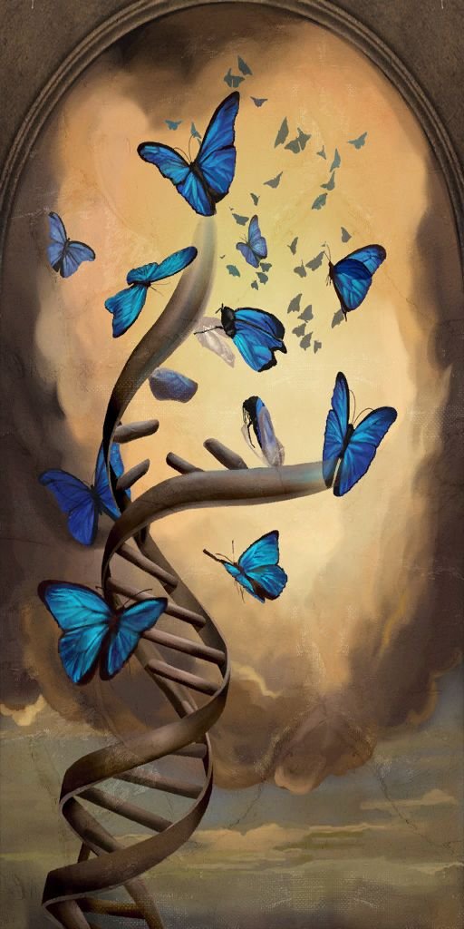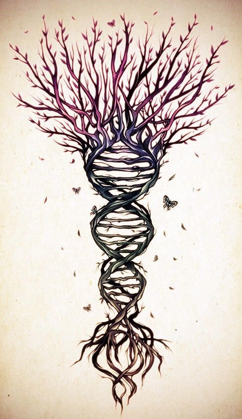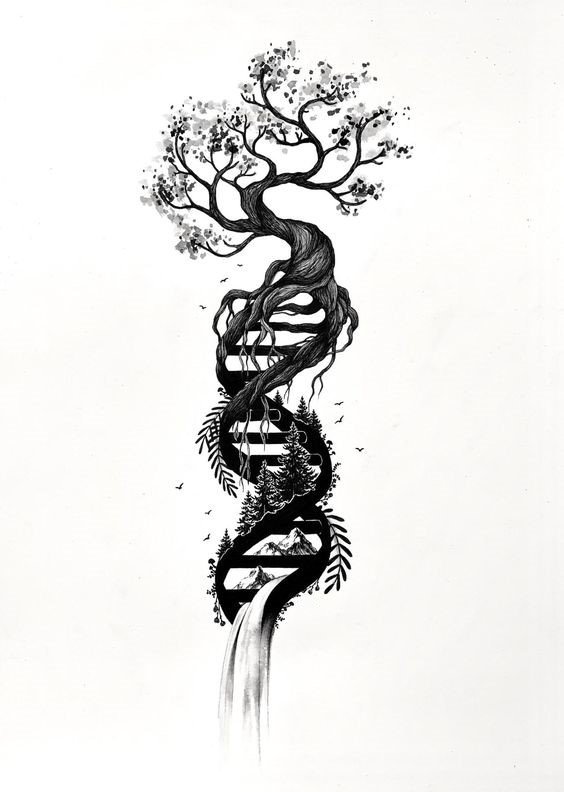 Die DNA-Spirale kann den Stamm eines Baumes auf einer Skizze umwickeln, sie kann die Zweige und die Krone umfassen oder vielleicht sogar den Baumstamm selbst darstellen. Auf diese Weise kann eine Parallele zwischen der menschlichen Welt und der Natur gezogen werden.