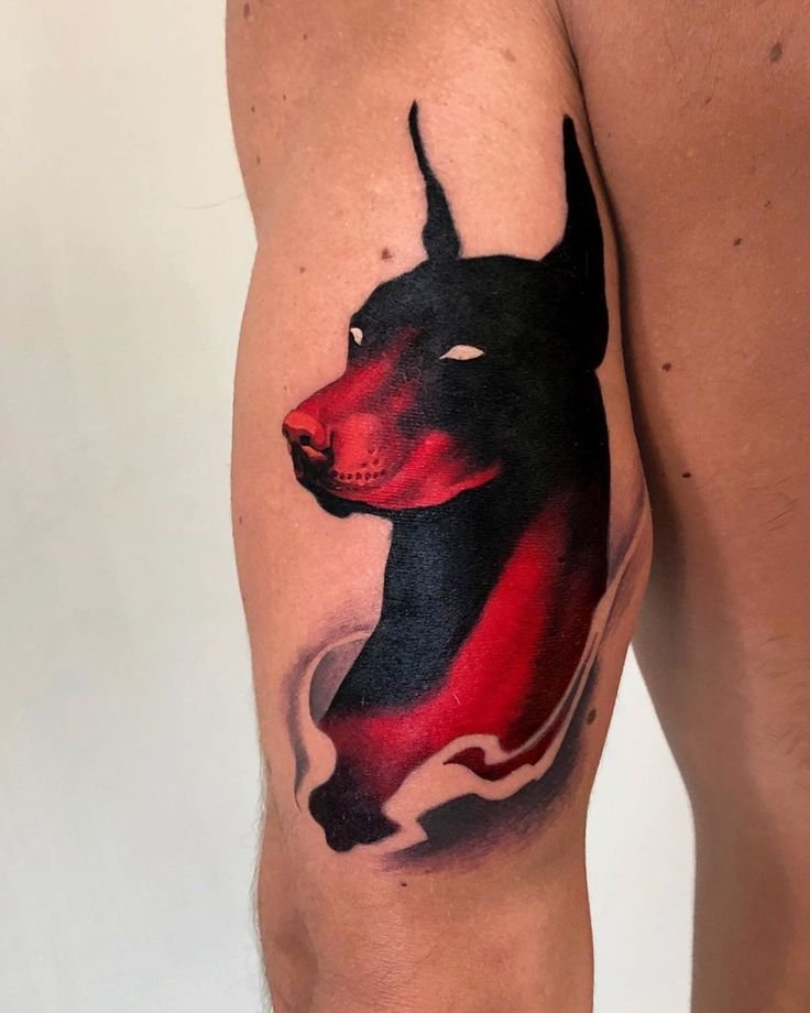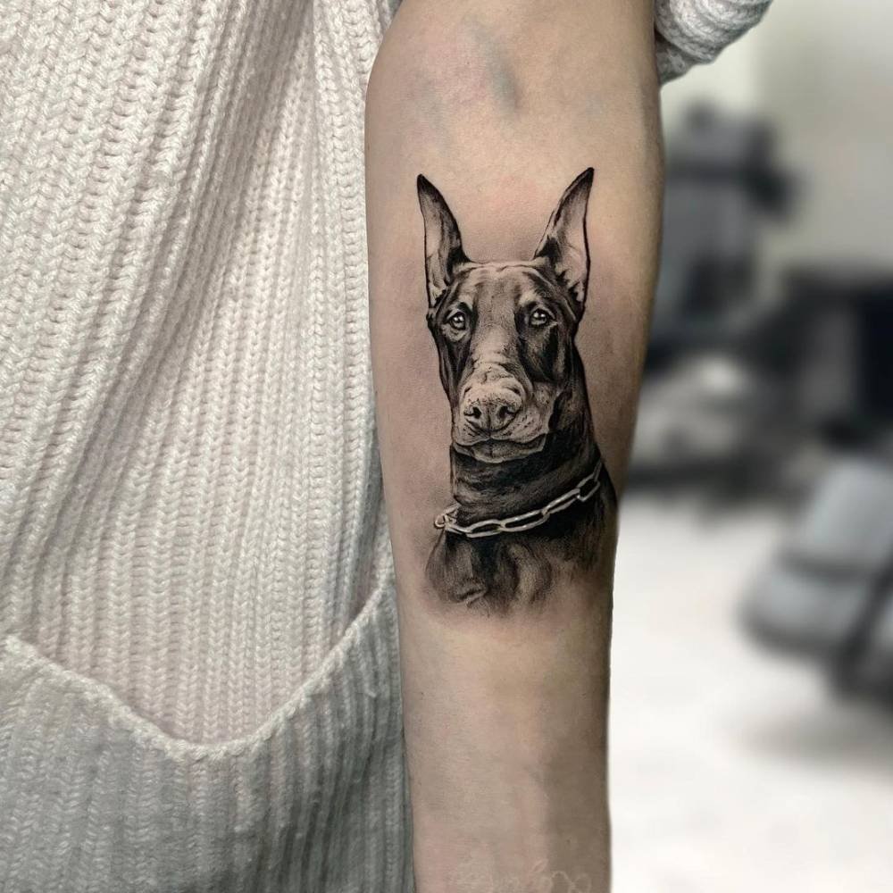 - Diese Hunderasse unterscheidet sich von anderen Rassen durch ihre unglaubliche Stärke und Hingabe an ihren Besitzer. Darauf aufbauend bestimmt das Dobermann-Tattoo die Charaktereigenschaften des Tätowierungsinhabers. Dies ist eine treue, hingebungsvolle Person, aber er kann auch aggressiv sein.