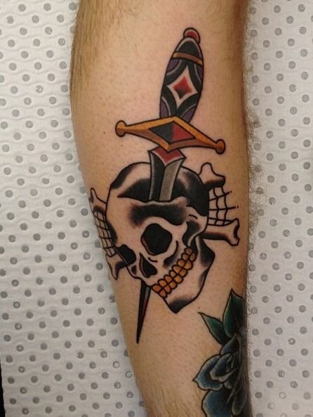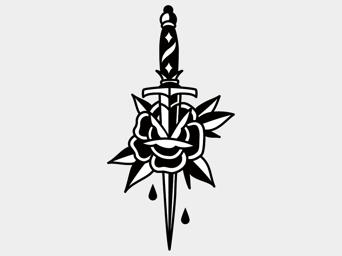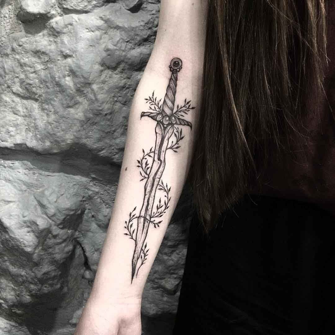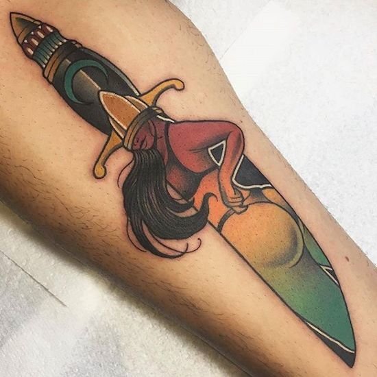 Der Dolch wird auf den kleinen Körperflächen ausgeführt, die am besten geeigneten Stellen sind: Arm, Unterarm, Bein, ebenfalls wird solch ein Tattoo auf der Weiche gemacht.