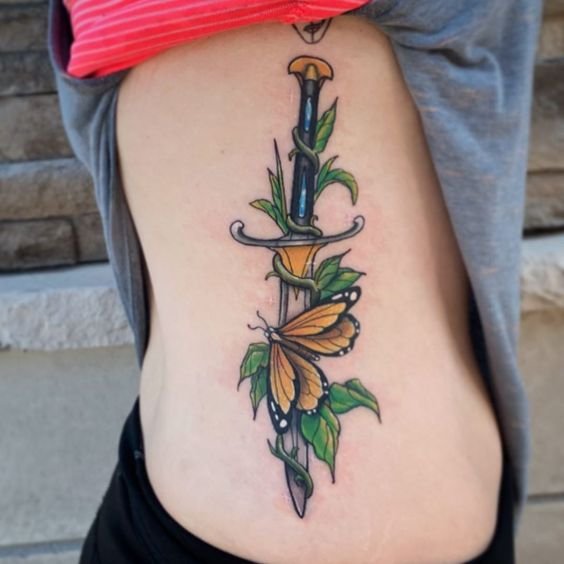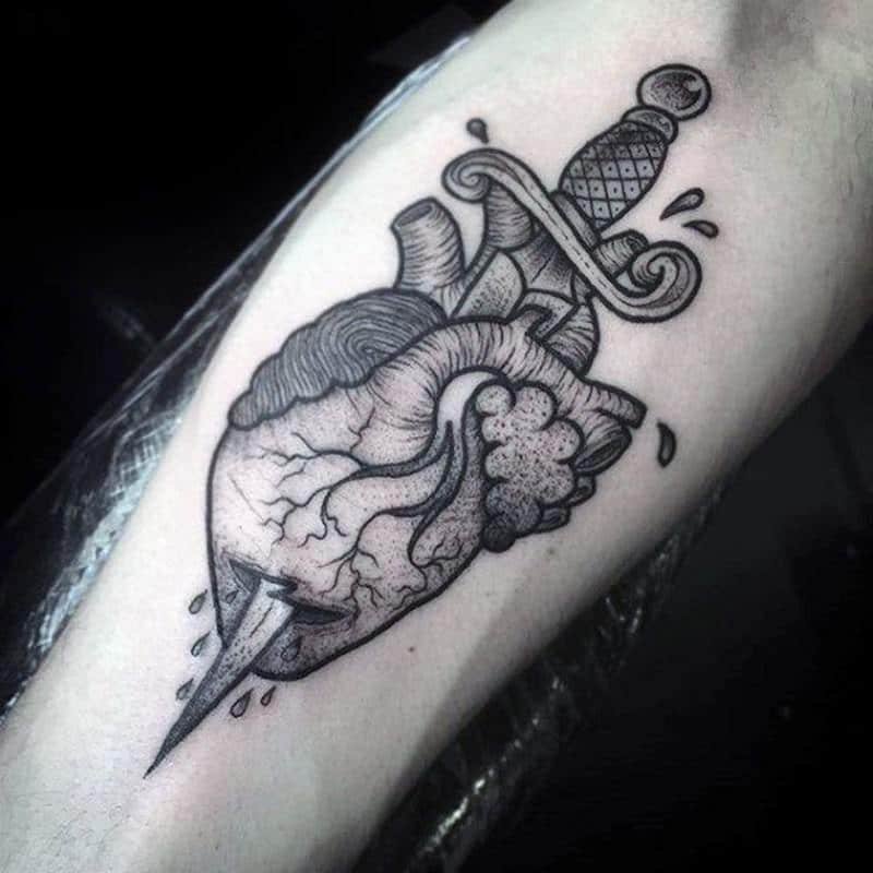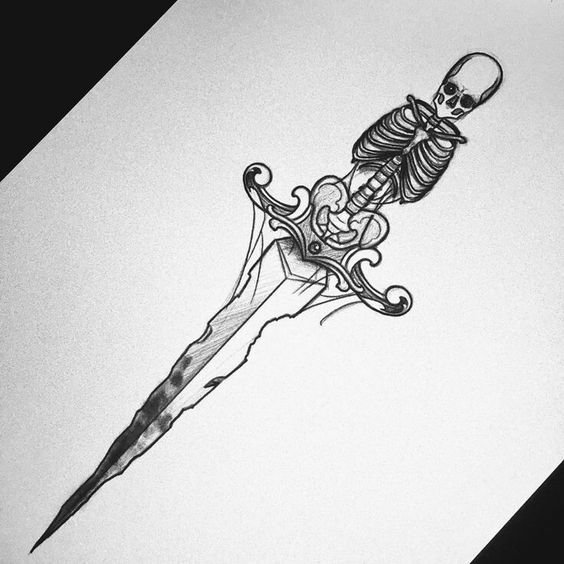 Das Dolch Tattoo, das den Körper durchdringt, zeigt, dass der Träger dieses Bildes es satt hat, wie ungerecht die Welt ist.