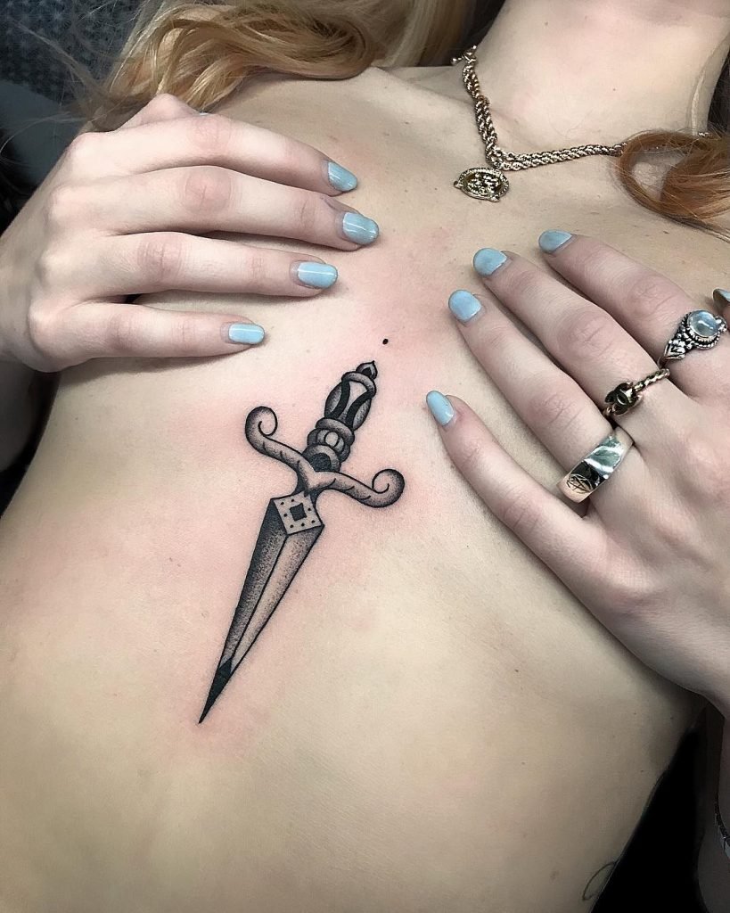 Im Mittelalter war diese Waffe die letzte Verteidigung im Kampf. Mit Hilfe eines Dolches beendete der Krieger selbständig sein Leben, wenn es nötig war, und blieb dabei seine Ehre vorbehalten. Deshalb wird Tattoo mit einem Dolch dargestellt, auf dessen Klinge ein Blutstropfen fließt. Dieses Bild wird als Furchtlosigkeit und Bereitschaft, sich erforderlichenfalls zu opfern, interpretiert. Demnach bezieht sich das Dolch Tattoo eher auf die Männerkategorie, auf den Frauenkörper ist ein solches Bild ganz selten. Dies ist jedoch nicht die einzige Bedeutung für ein Dolch Tattoo. Es gibt einige weitere interessante Interpretationen, die im Folgenden vorgestellt werden.