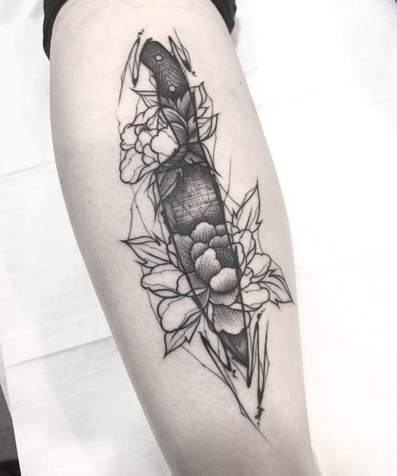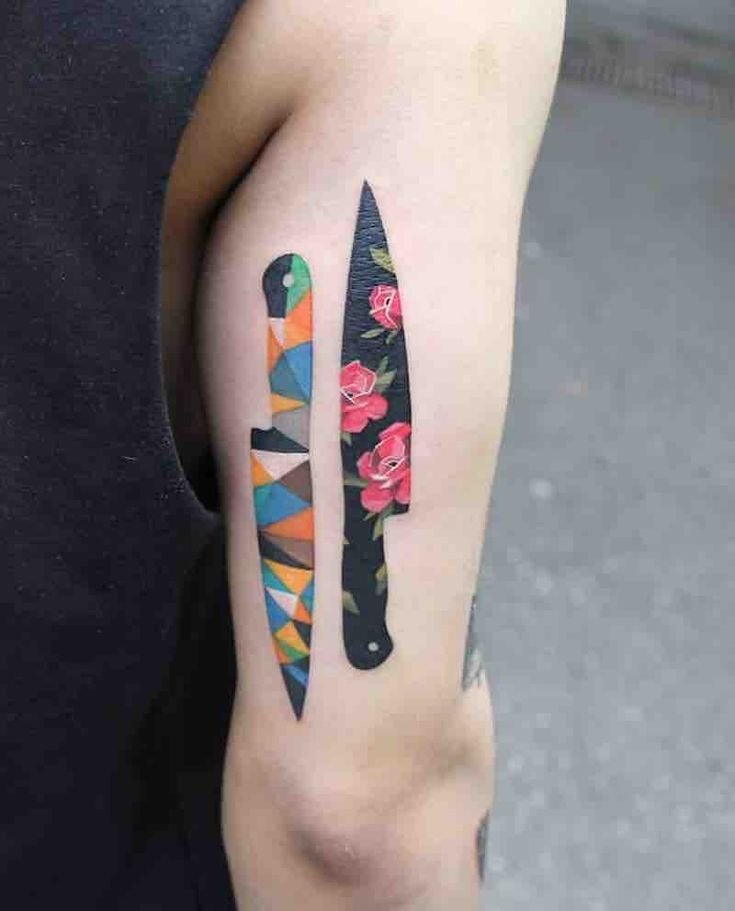 Der Dolch kann sowohl allein, als auch mit zusätzlichen Elementen ausgeführt werden. Zum Beispiel schmücken Frauen ein solches Tattoo mit Blumen, leuchtenden Farben oder Anschriften. Die Varianten für Männer sind gröber und mit aggressiven Elementen.