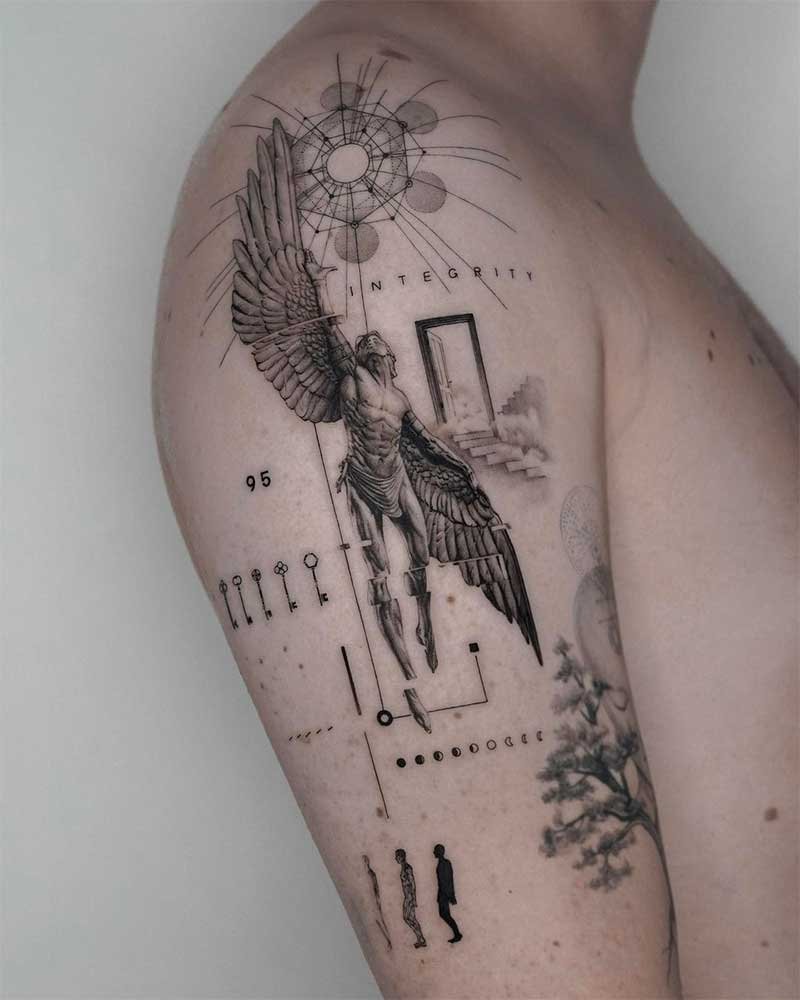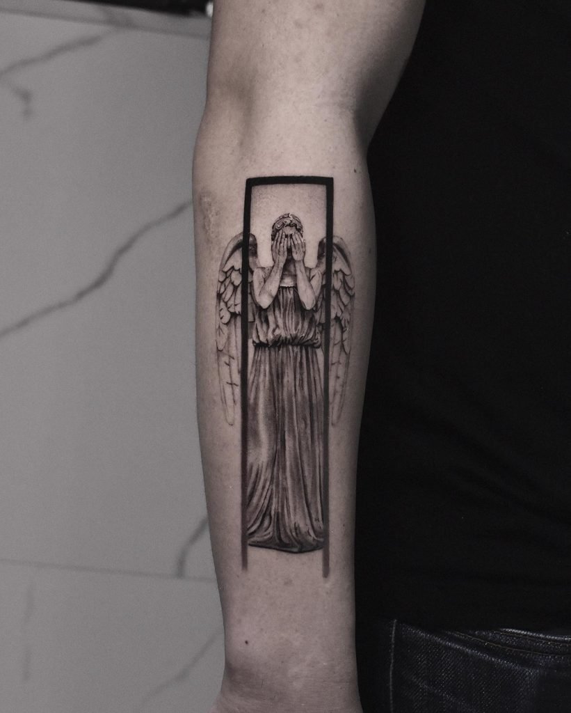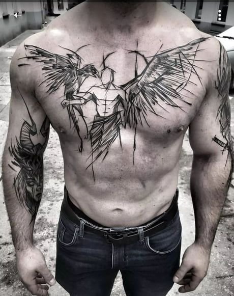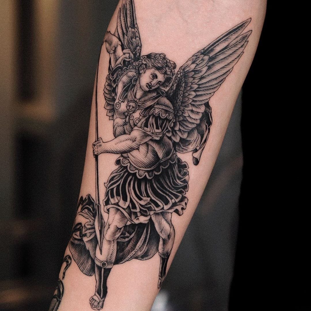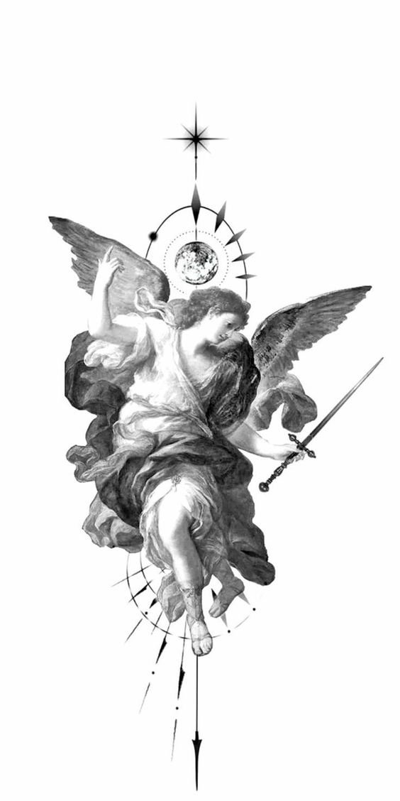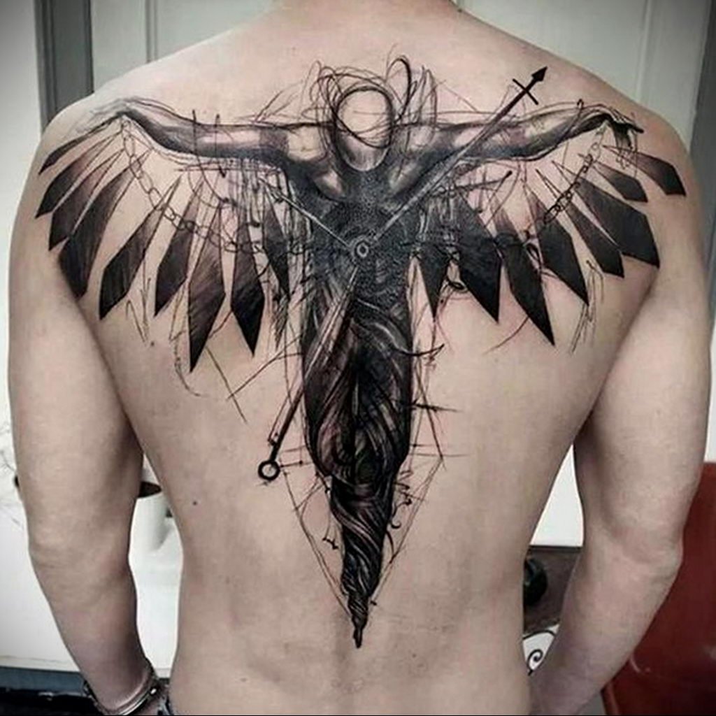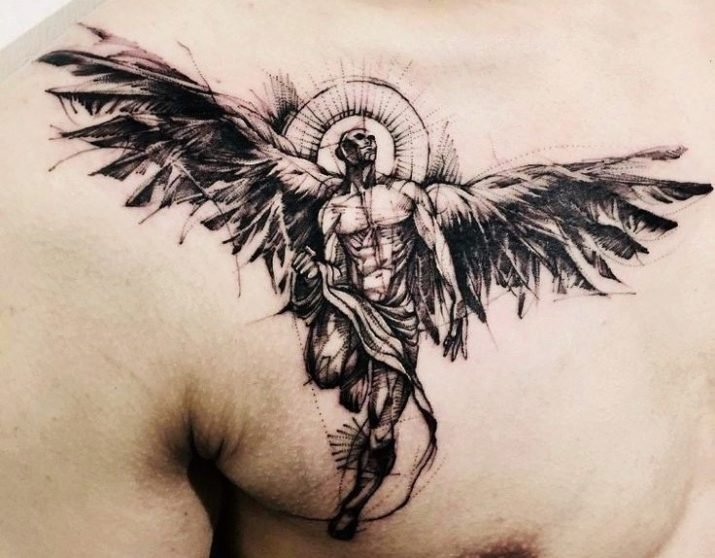 Diese Kreaturen verkörpern den Schutz des Menschen und seinen Kampf gegen die Dunkelheit. In diesem Fall findet der Kampf nicht nur mit der Dunkelheit der Welt statt, sondern auch in sich. Darauf basierend verkörpert das Tattoo mit dem Bild des Erzengels den ständigen inneren Kampf des Menschen.