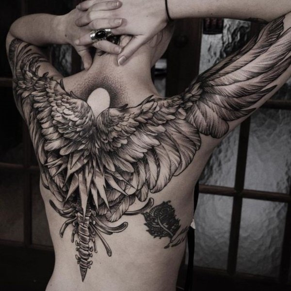 Die Flügel verkörpern den Schutz des Menschen und seine Freiheit. Einige Leute betonen mit diesem Bild auch ihre Verbindung zu Gott. Gebrochene Flügel zeigen an, dass sich im Inneren eines Menschen etwas Wichtiges Sorgen macht. Verbreitete Flügel bedeuten Stärke und Güte. Für Frauen ist dieses Tattoo die Personifizierung der Zärtlichkeit und für Männer ein Zeichen von Stärke und Schutz.