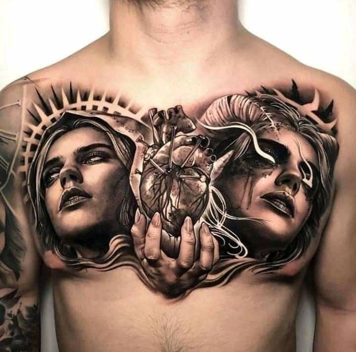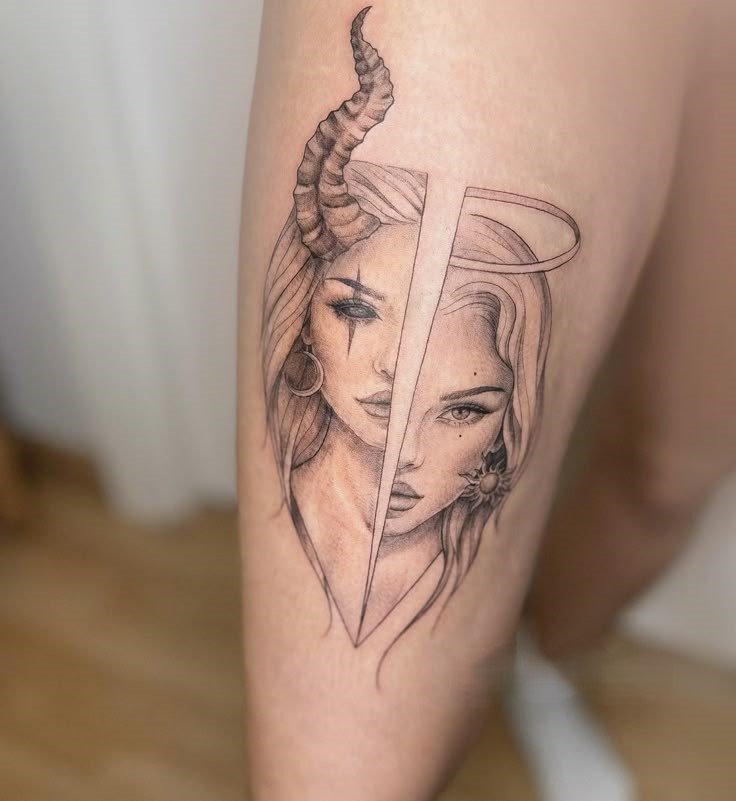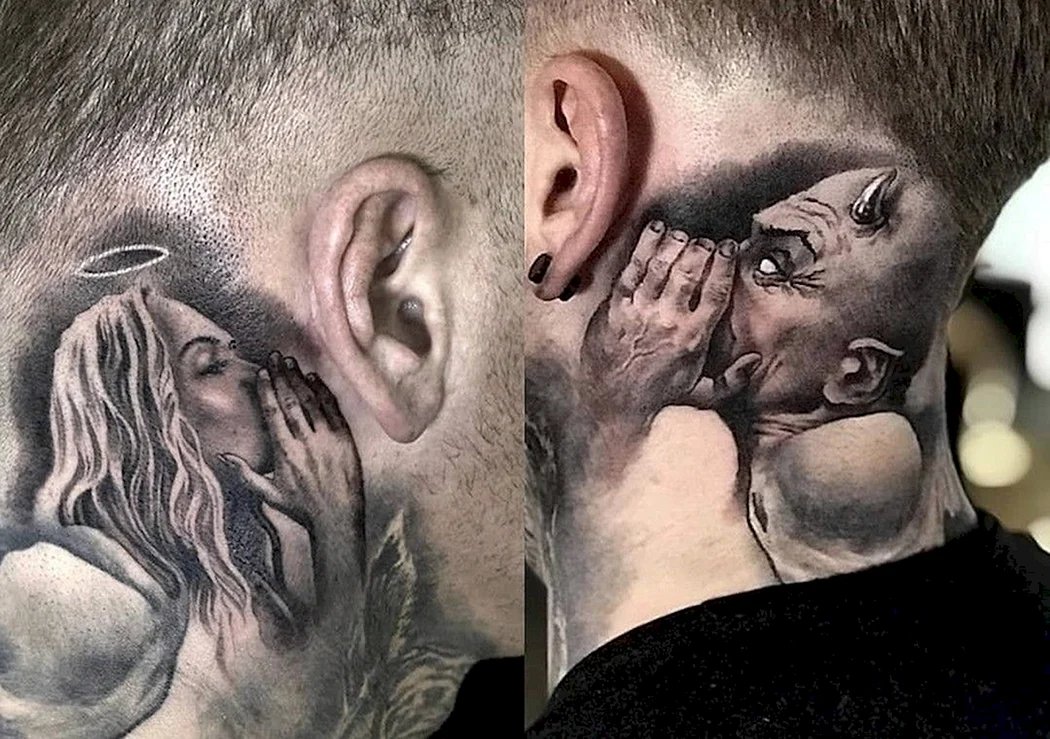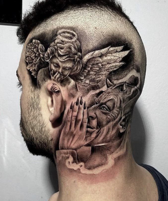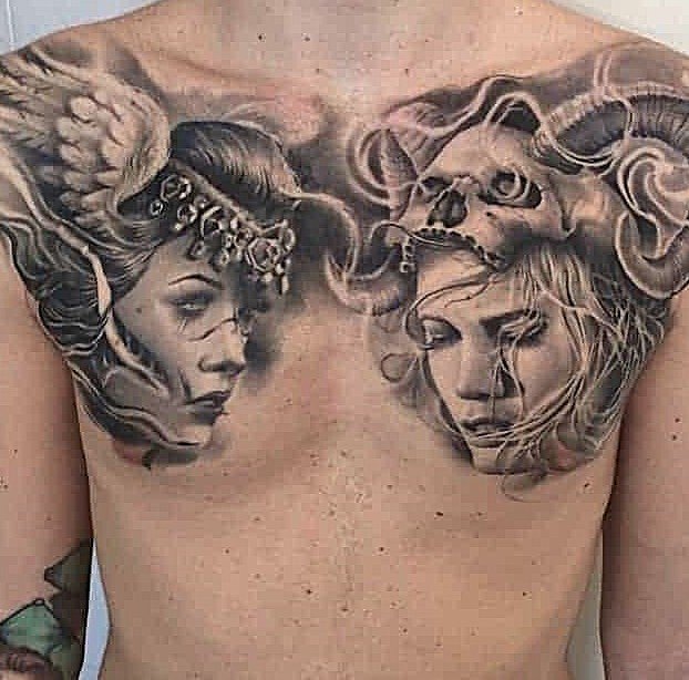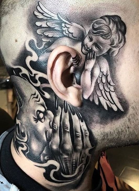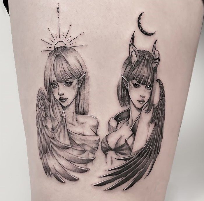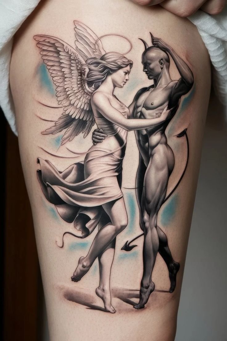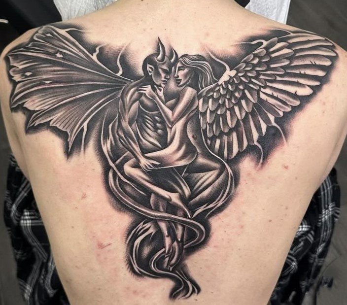Die Bedeutung des Engel-und-Teufel-Tattoos liegt in der ewigen Dualität zwischen Gut und Böse, Licht und Schatten, Unschuld und Versuchung.