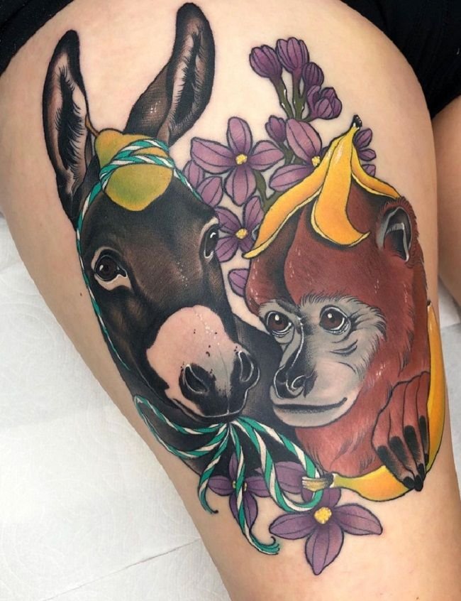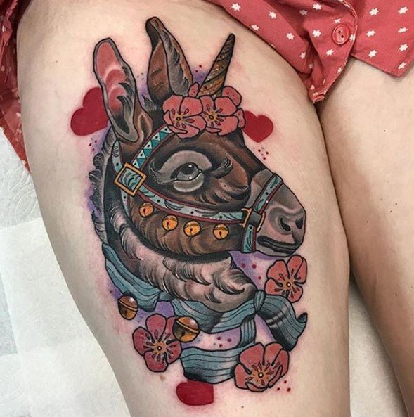 Was die Farbwiedergabe anbelangt, so wird der Esel häufig einfarbig dargestellt, unabhängig davon, in welchem Körperbereich er platziert wird. Der Kunde selbst kann eine beliebige Palette wählen, um sein Werk einzigartig zu machen. Sie können nicht standardmäßige Farben berücksichtigen, andere Symbole hinzufügen, das Bild hell und gesättigt machen.